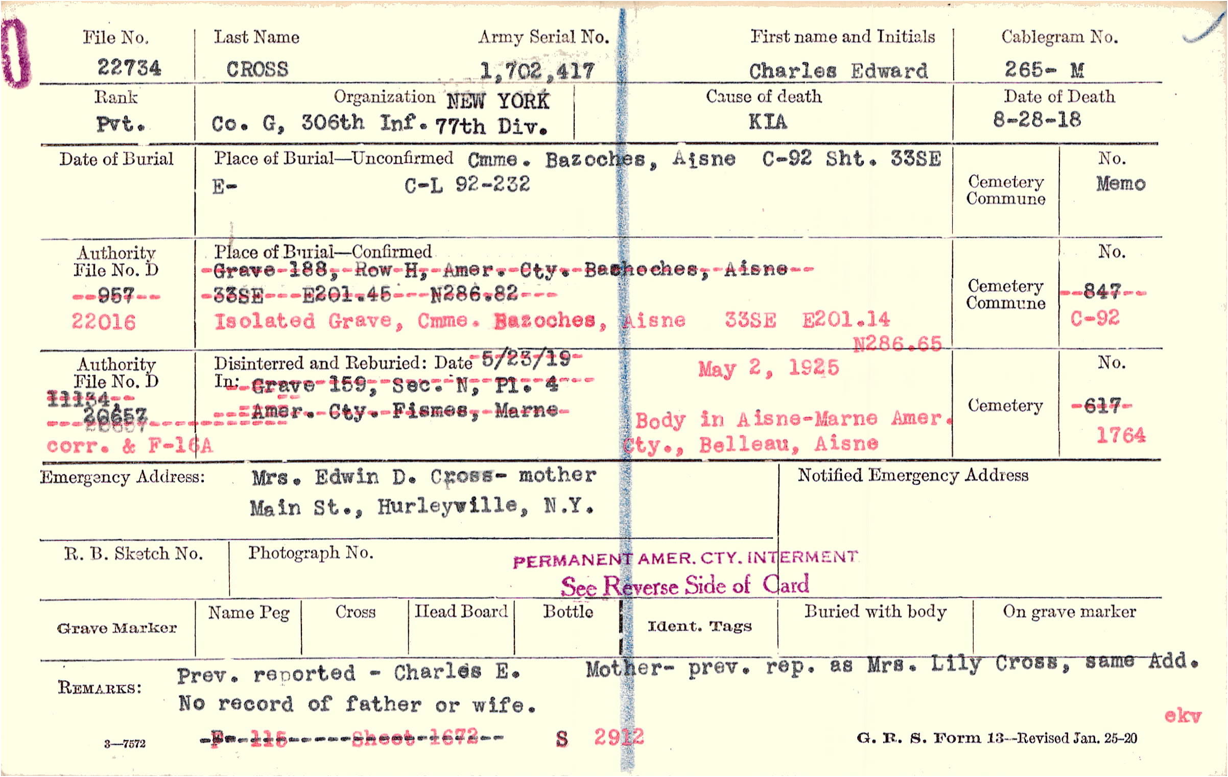 Prev. reported - Charles E. Mother prev. rep. as Mrs. Lily Cross, same Add. No record of father or wife., [del]F- 115 Sheet 1672[/del] S 2912