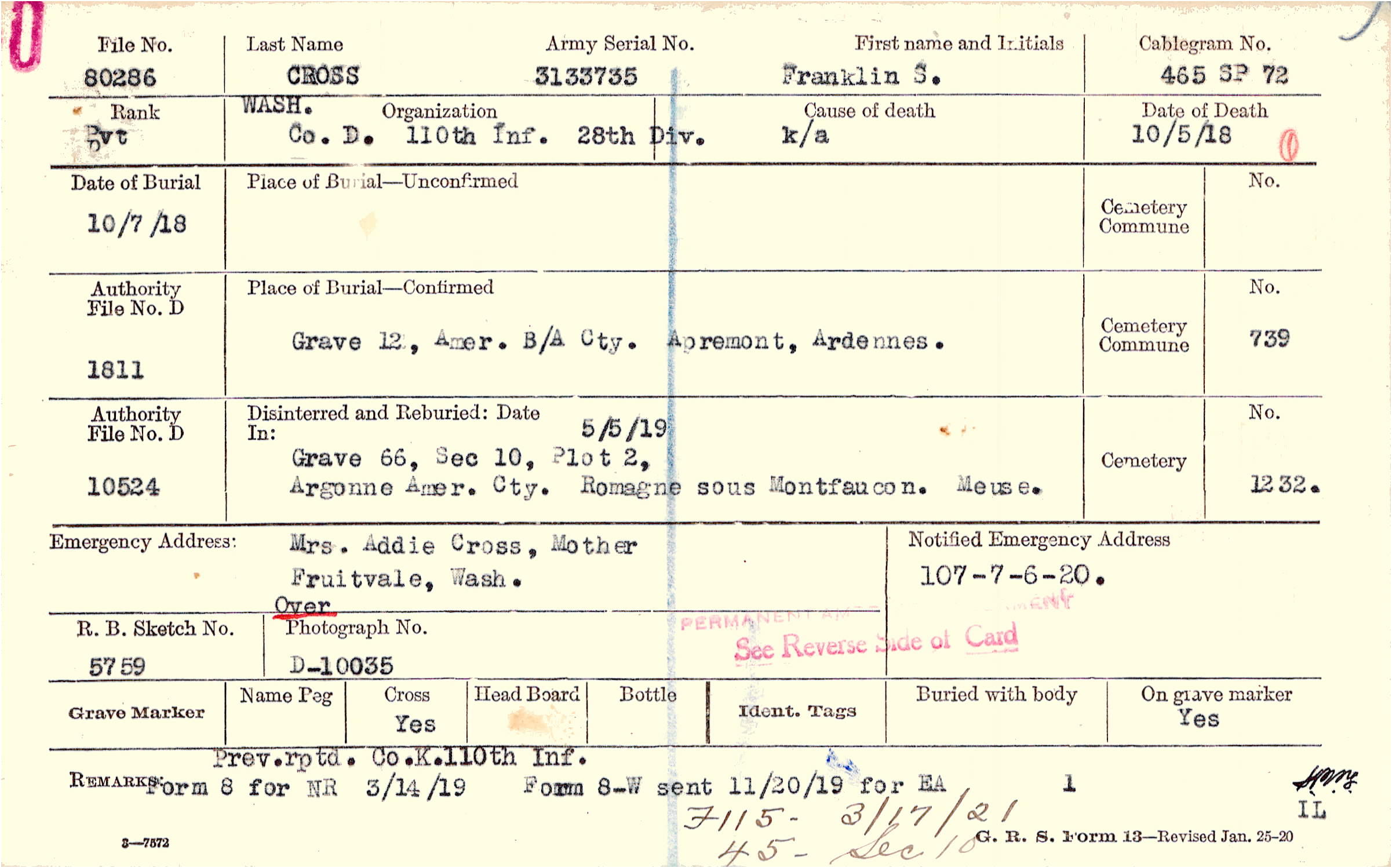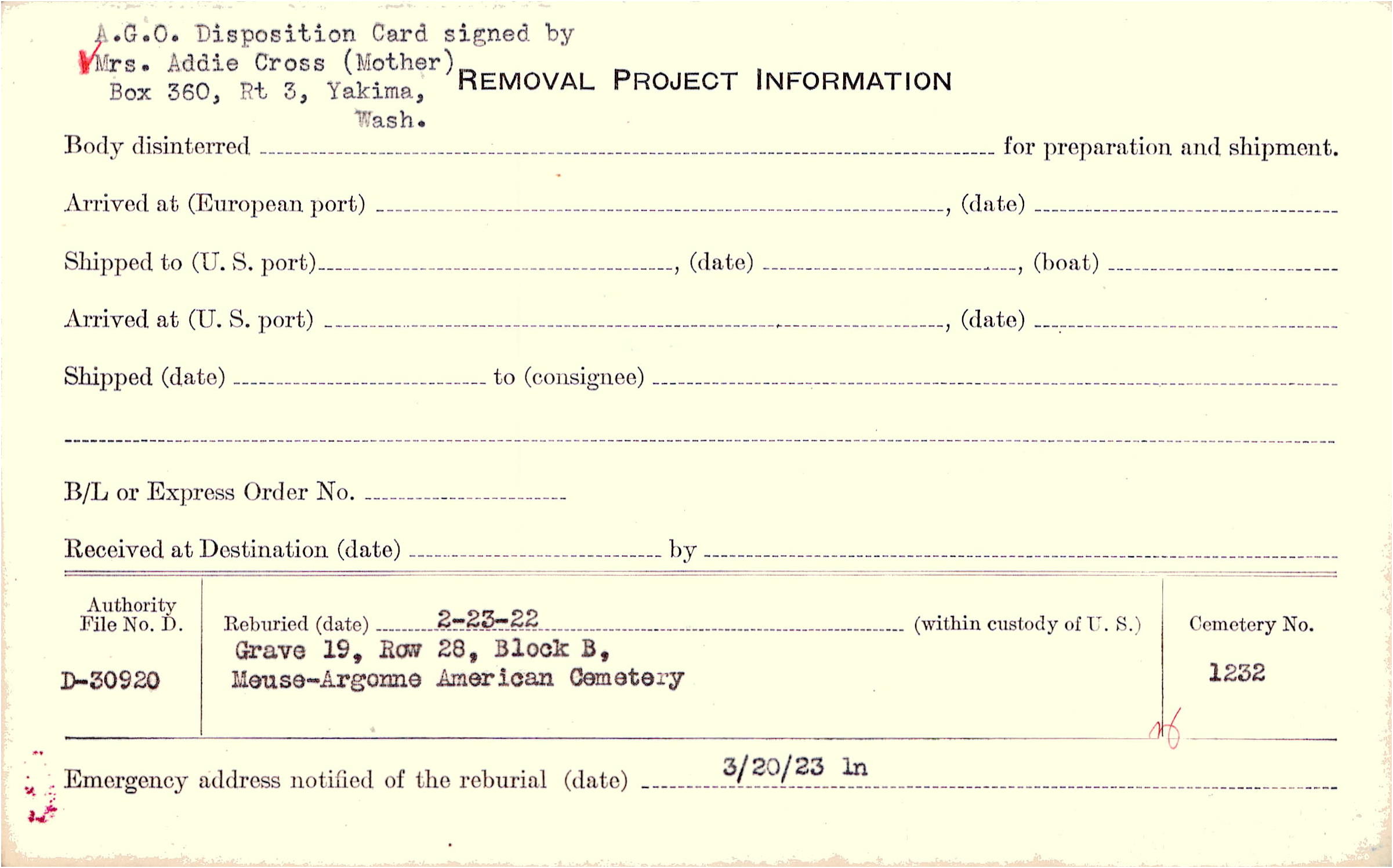 A.G.O Disposition card signed by Mrs. Addie Cross (Mother), Box 360, Rt. 3, Yakima, Wash. |