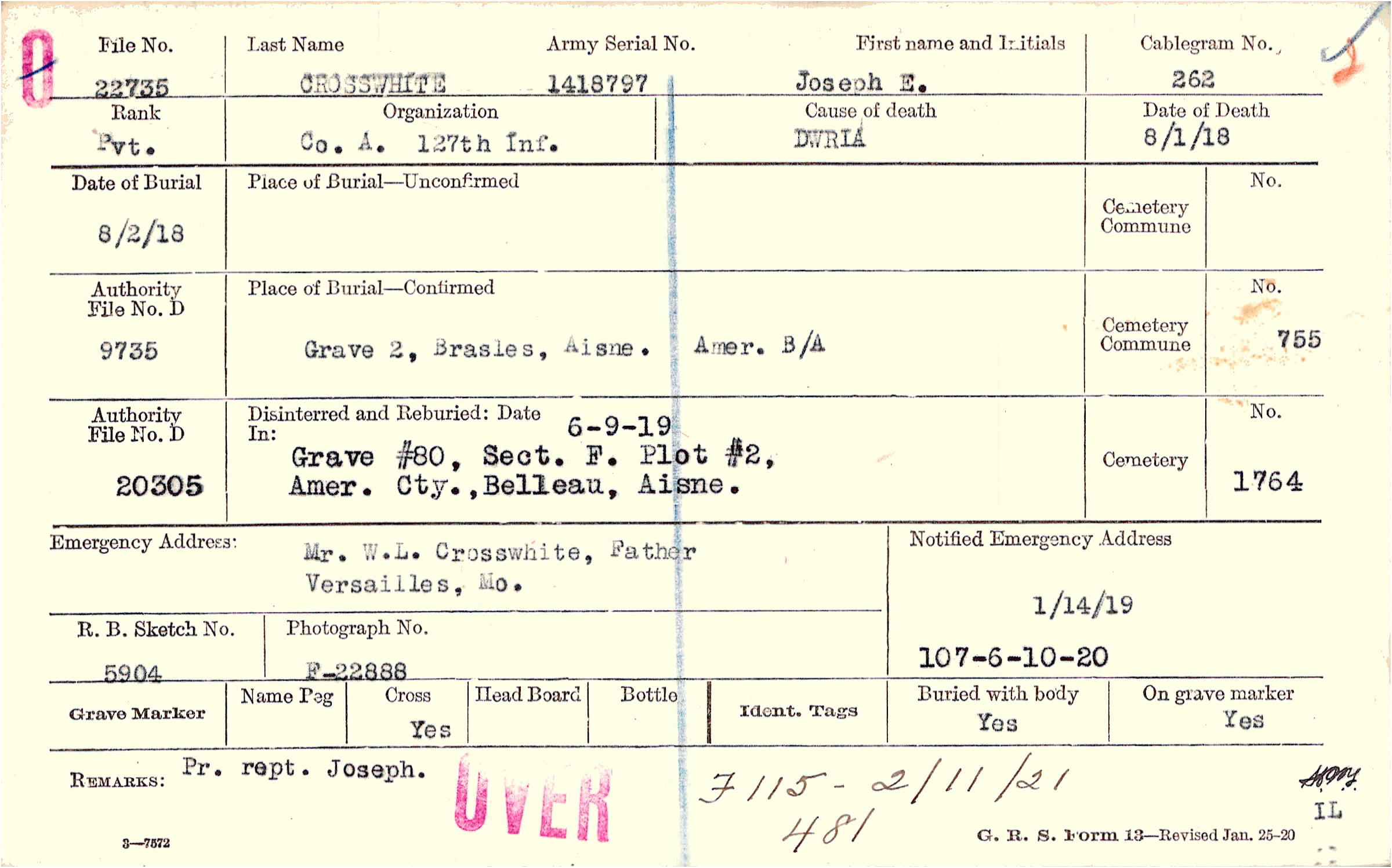 Grave 80, Section F, Plot 2, American Cemetery, Belleau, Aisne