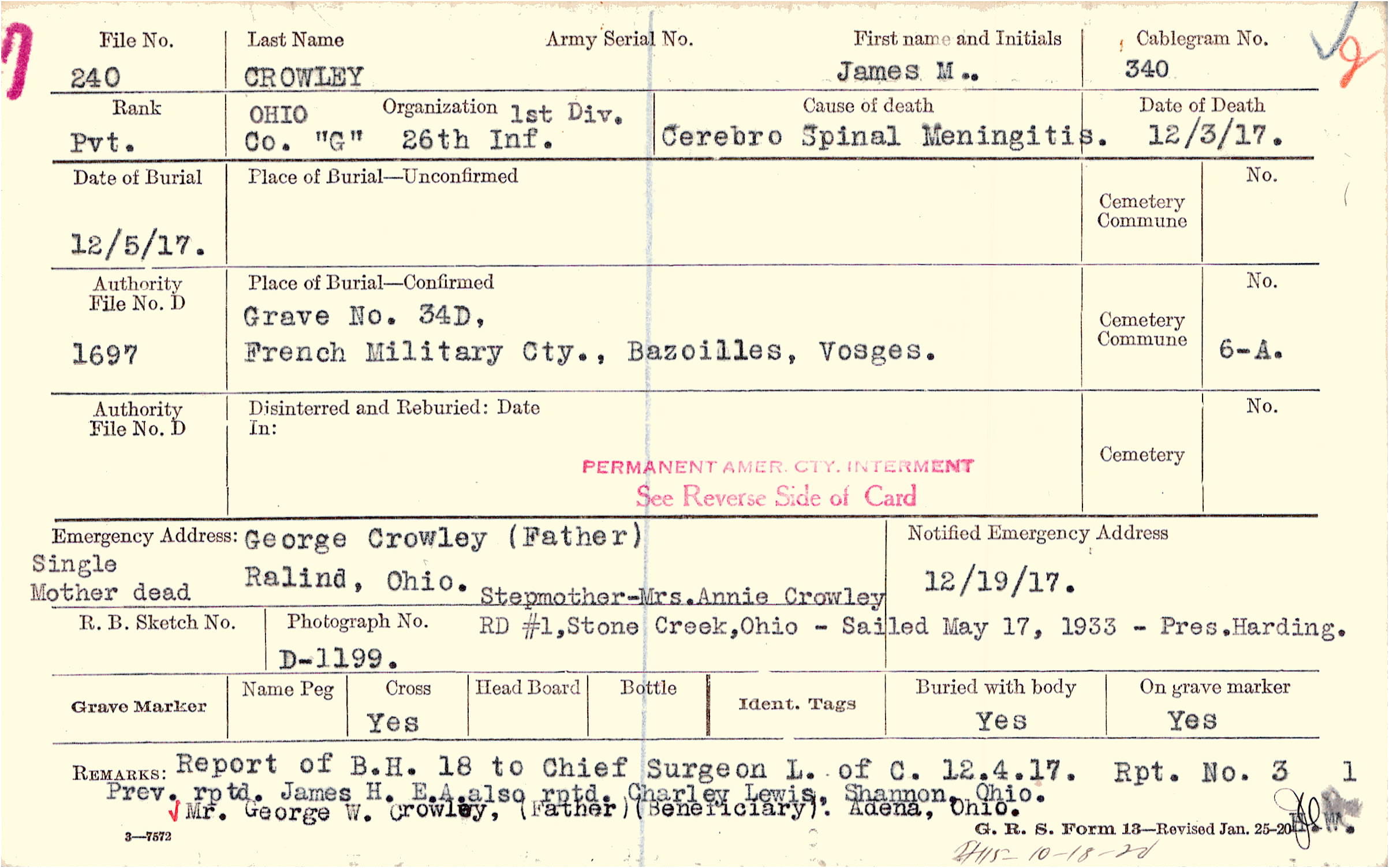 Report of B.H. 18 to Chief Surgeon L. of C. 12.4.17. Rpt. No. 3 Prev. rptd. James H. E.A. also rptd. Charley Lewis, Shannon, Ohio. Mr. George W. Crowley, (Father) (Beneficiary) Adena, Ohio., F#115-10-18-20