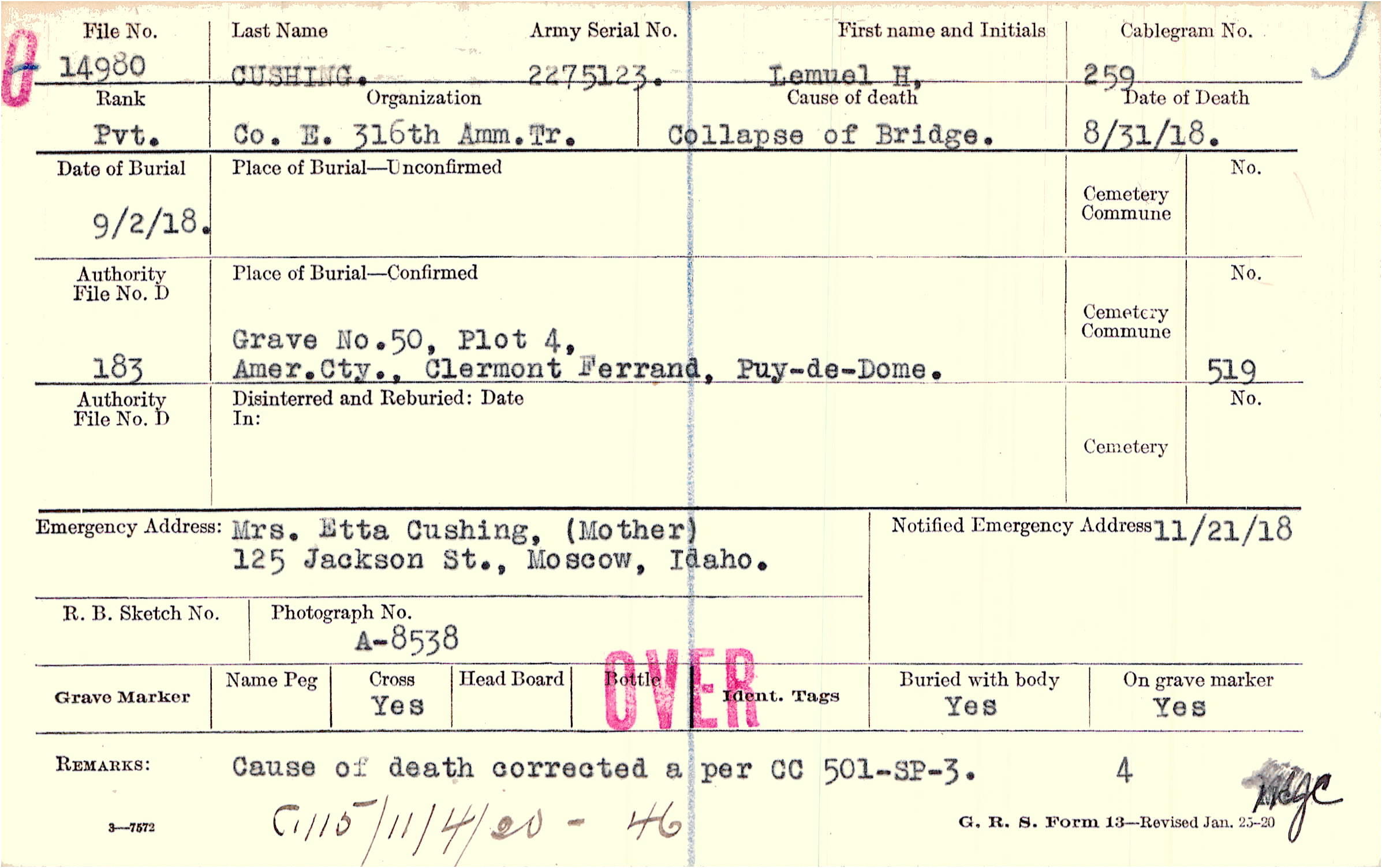 Mrs. Etta Cushing, (Mother), 125 Jackson St., Moscow, Idaho.