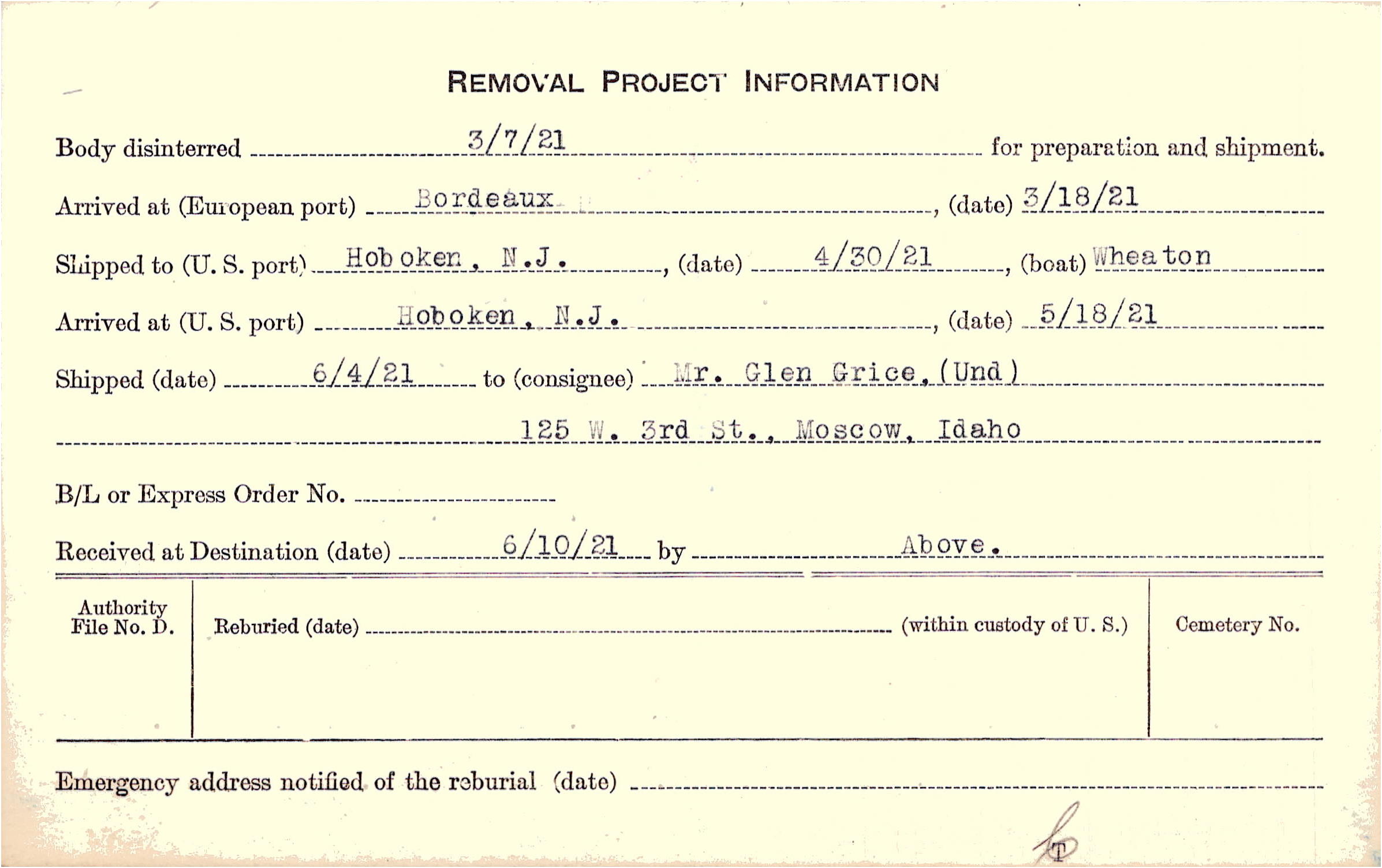 to Mr. Glen Grice, (Und) 125 W. 3rd St., Moscow, Idaho