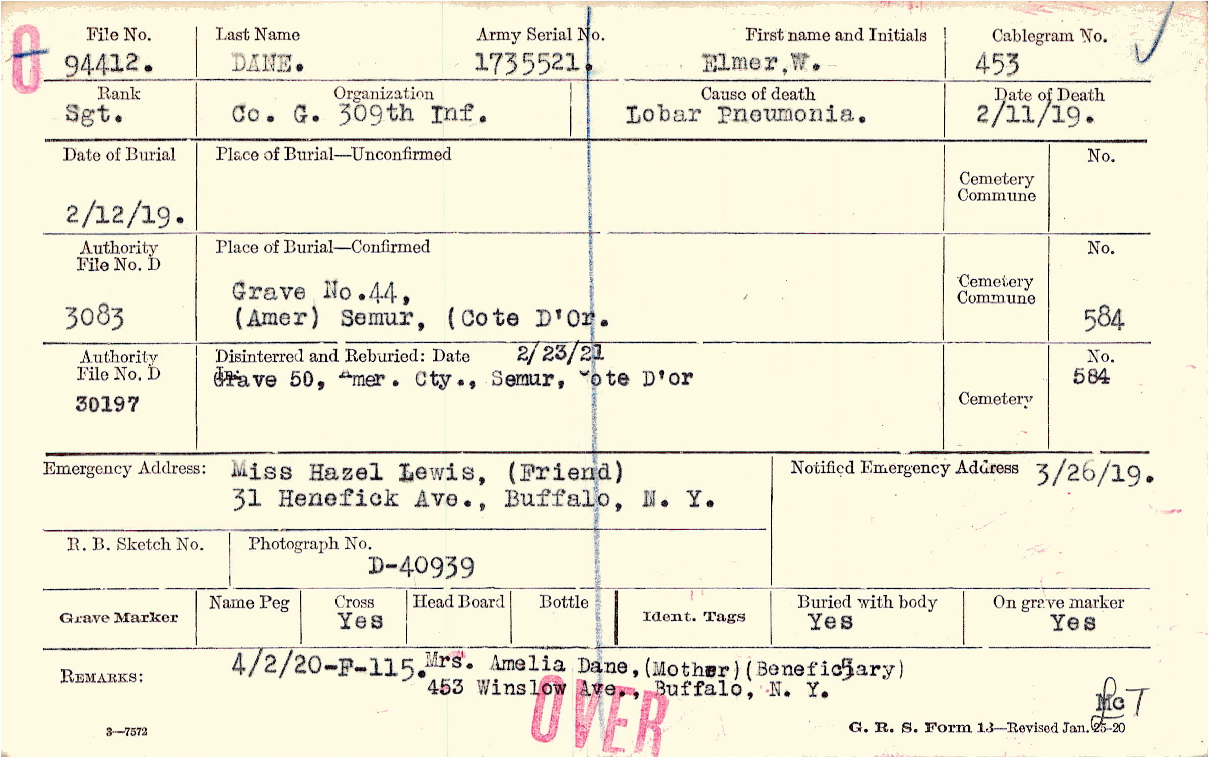 Mrs. Amelia Dane, (Mother) (Beneficiary) 453 Winslow Ave., Buffalo, N. Y., 4/2/20 F-115.