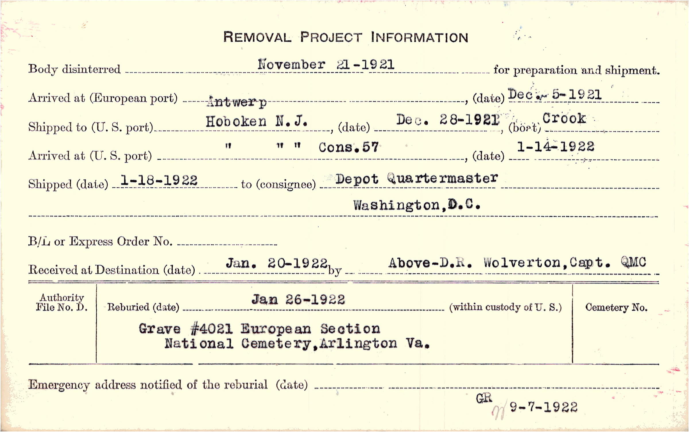 Body disinterred 11/21/1921 for preparation and shipment.