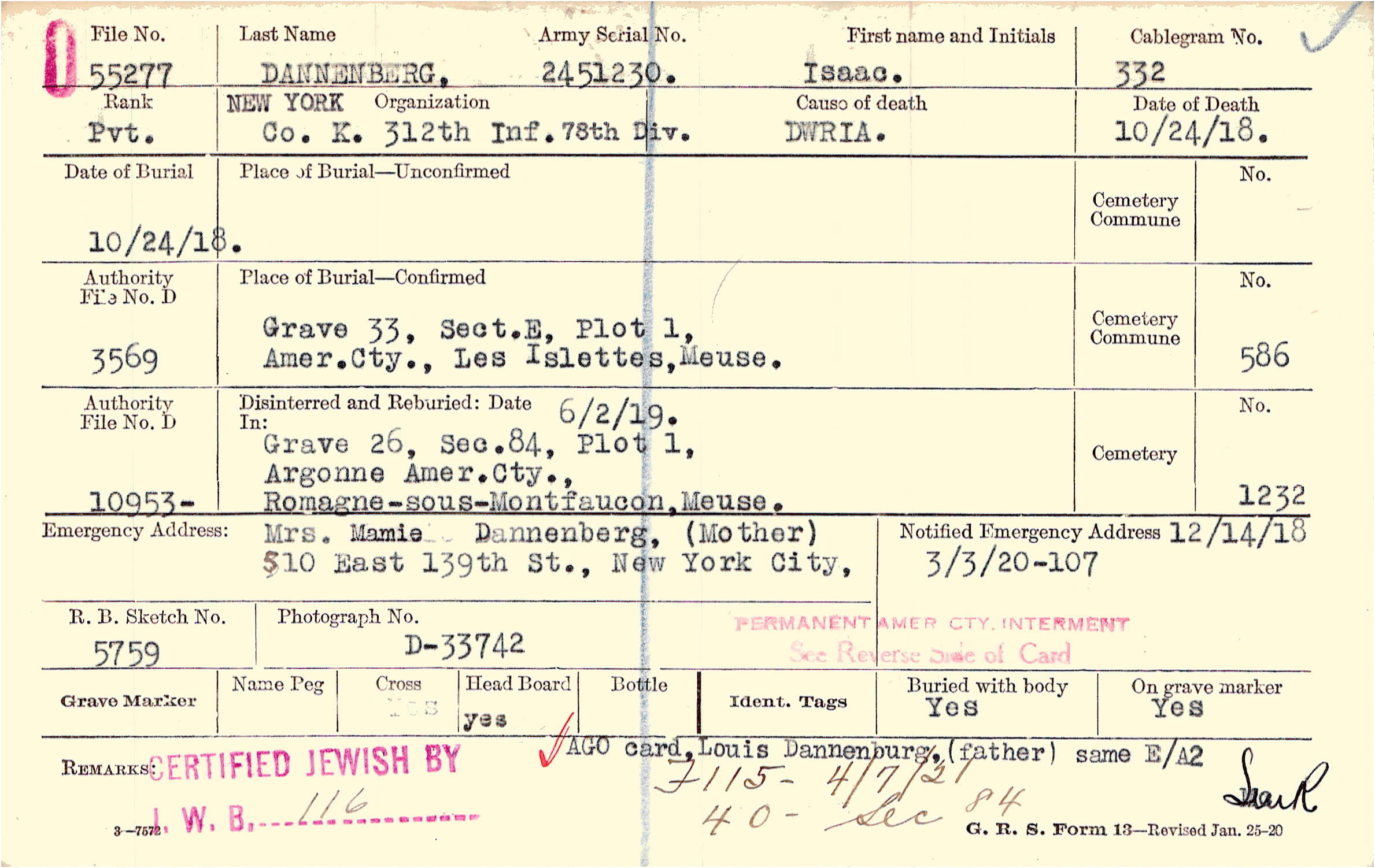 Mrs. Mamie Dannenberg, (Mother), 510 East 139th St., New York City,