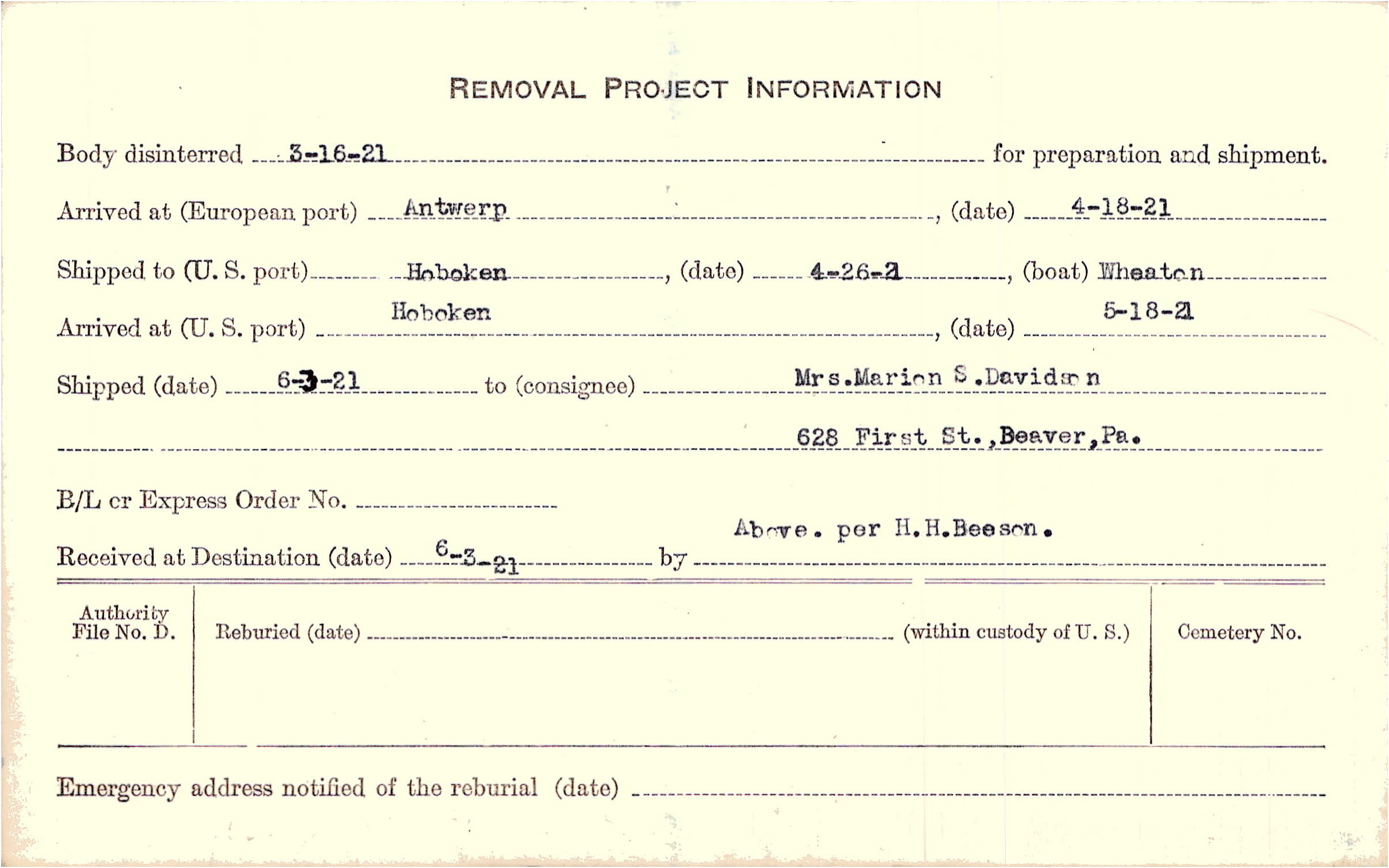Body disinterred 3/16/1921 for preparation and shipment.