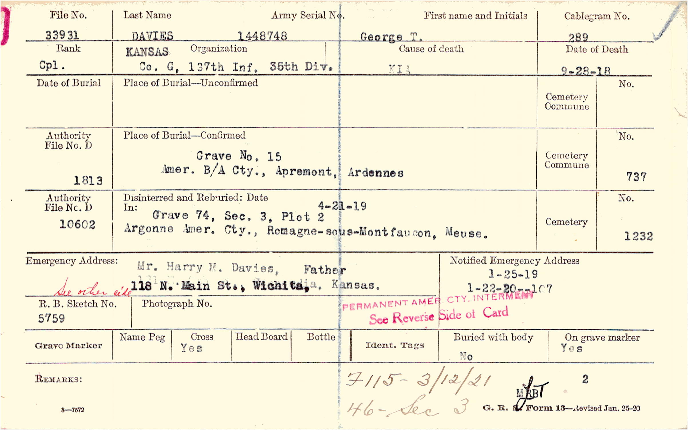 Mr. Harry M. Davies, Father, 118 N. Main St., Wichita, Kansas, See other side