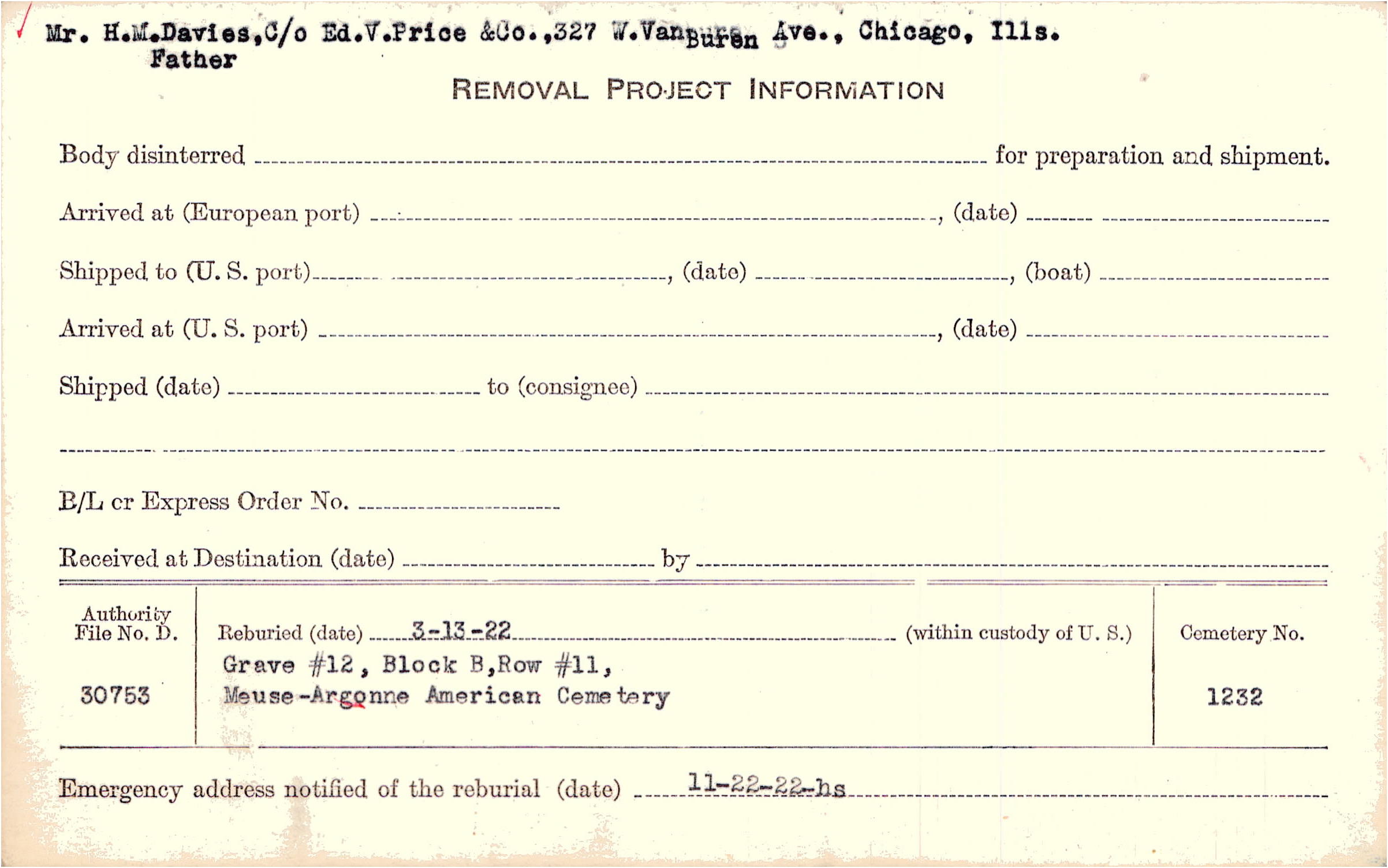 Mr. H. M. Davies, Father, C/o Ed. V. Price & Co., 327 W. VanBuren Ave., Chicago, Ills. |