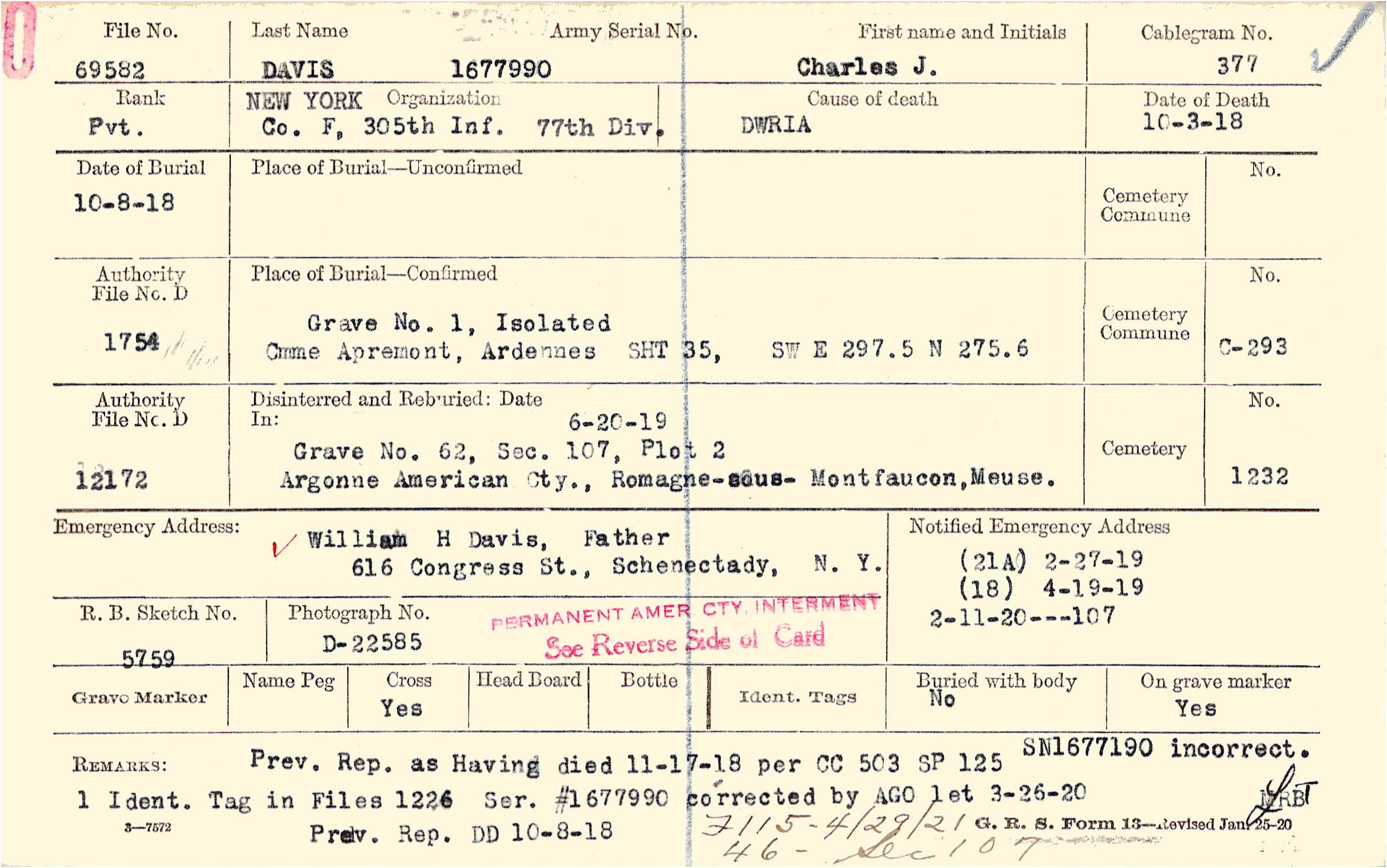 Prev. Rep. as Having died 11-17-18 per CC 503 Sp 125 SN 677190 Incorrect. Ident, Tag in Files 1226 Ser. 1677990 corrected by AGO let 3-6-20 Prev. Rep DD 10-8-18, F115 - 4/29/21 46-See 107