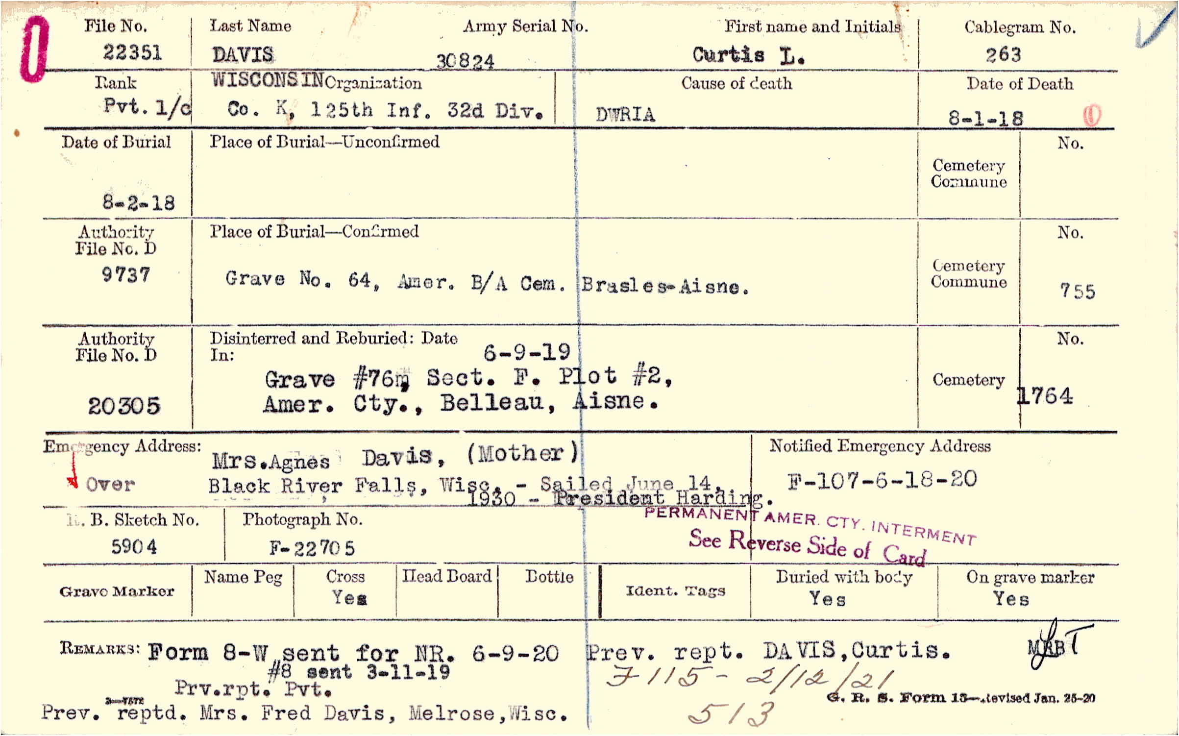 Prv.rpt. Pvt. Prev. reptd. Mrs. Fred Davis, Melrose, Wisc. Prev, rept. DAVIS, Curtis., Form 8-W sent for NR 6-9-20 #8 sent 3-11-19, #8 sent 3-11-19, F115 - 2/12/21 513