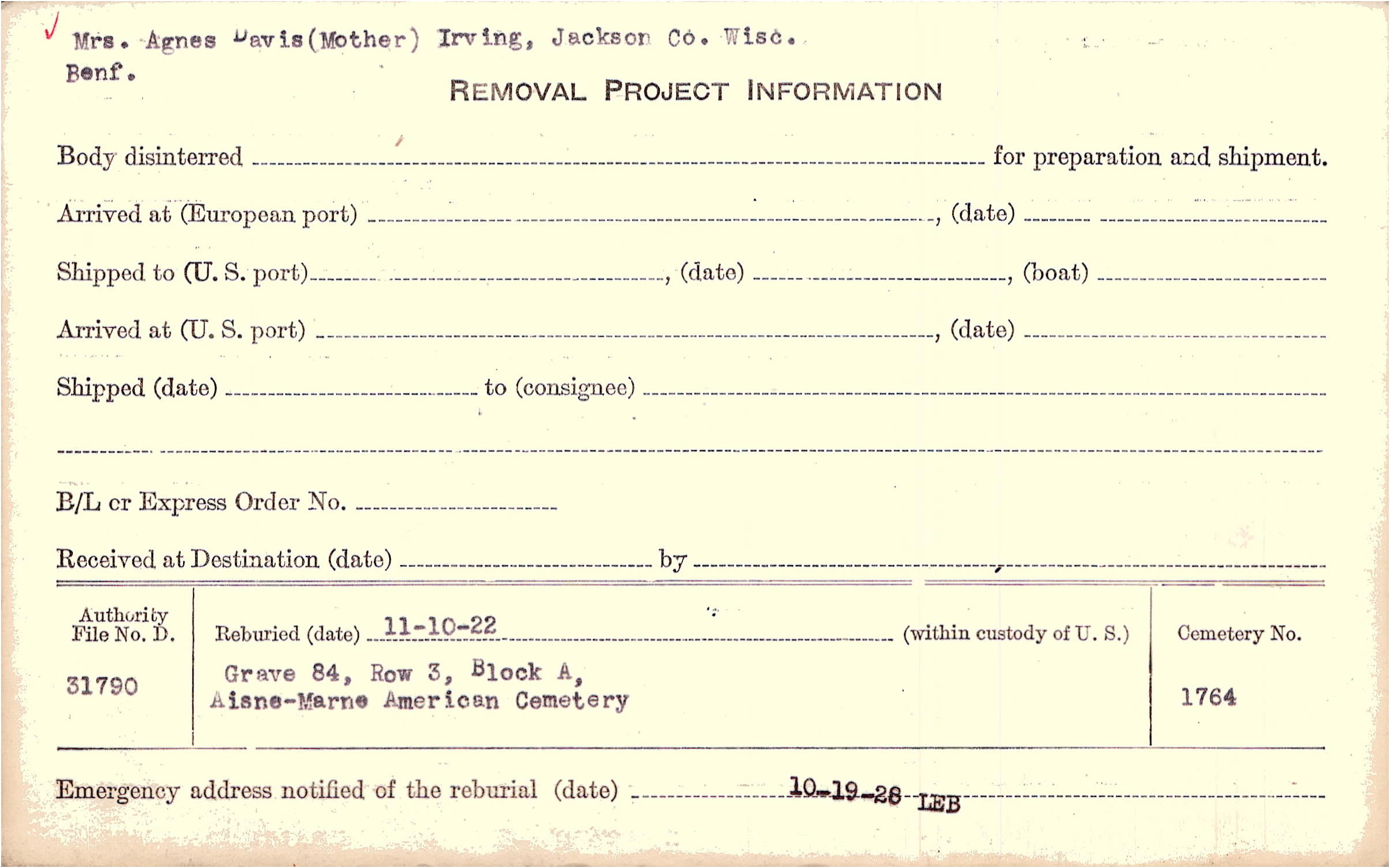 Mrs. Agnes Davis (Mother) Irving, Jackson Co. Wisc. Benf. |