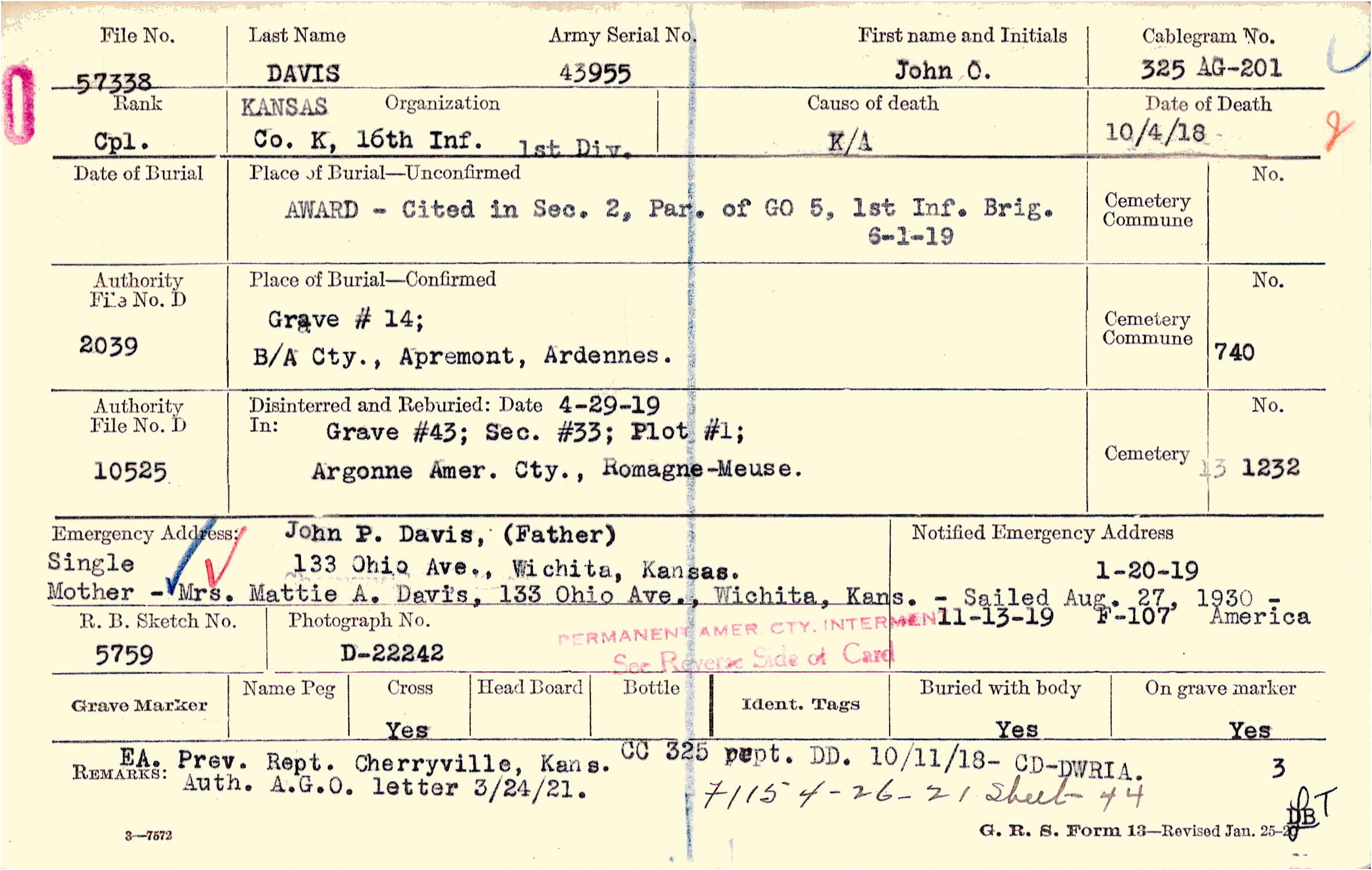 John P. Davis, (Father), 133 Ohio Ave., Wichita, Kansas., Single Mother - Mrs. Mattie A. Davis, 133 Ohio Ave., Wichita, Kans. - Sailed Aug. 27, 1930 - America