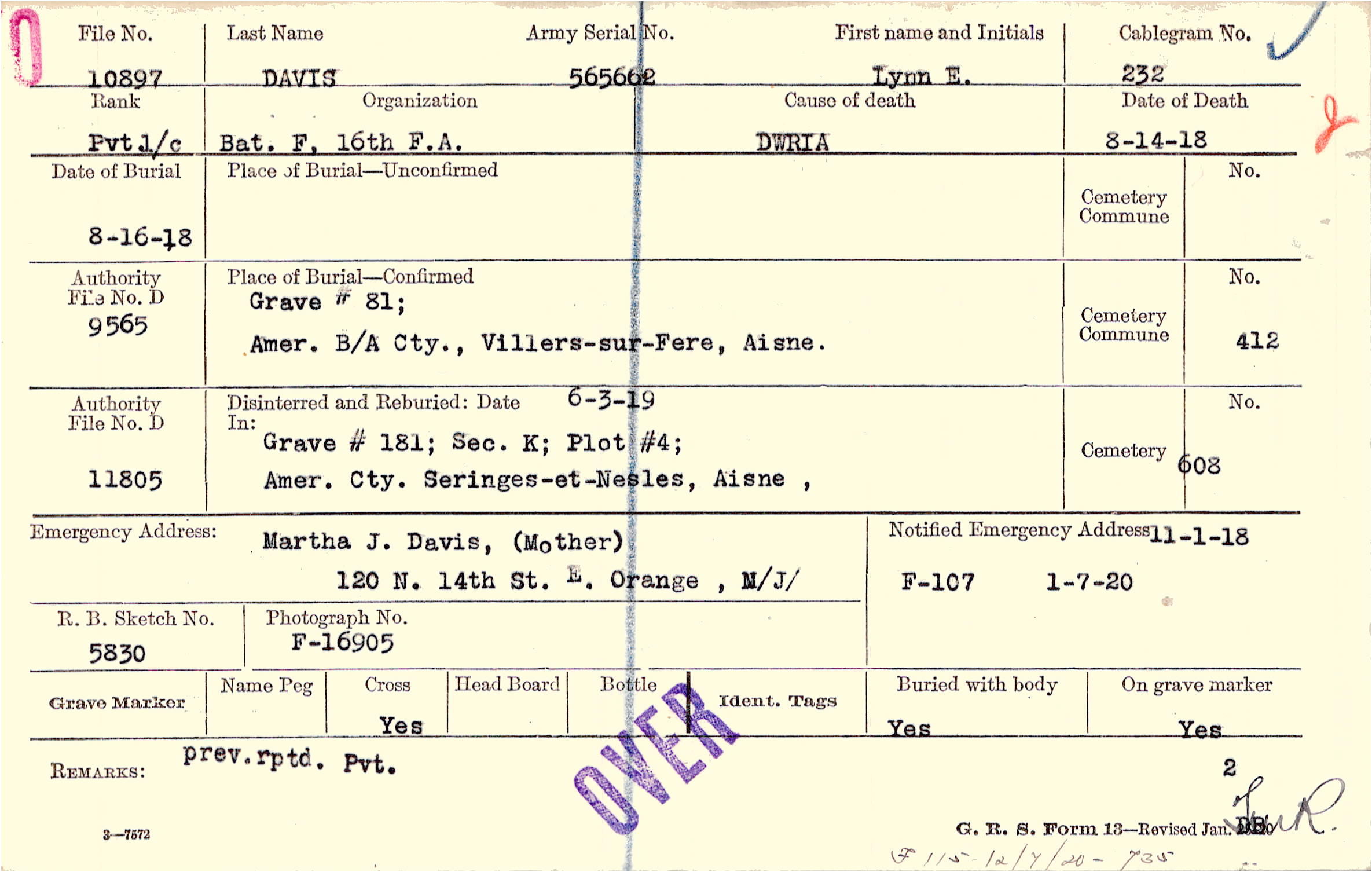 Martha J. Davis, (Mother), 120 N. 14th St. E. Orange , N/J/