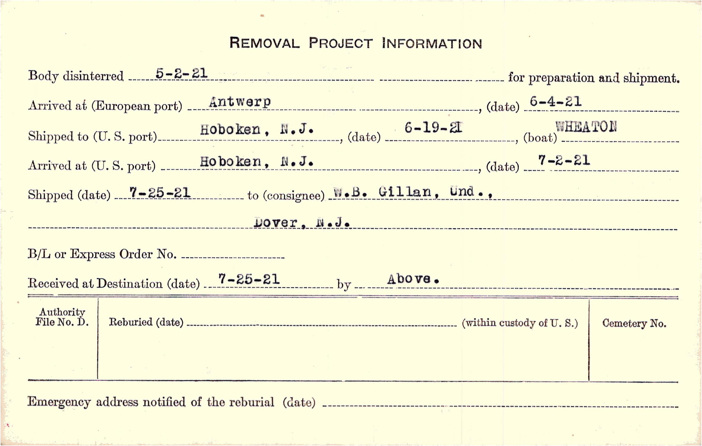 to W.B. Gillan, Und., Dover, N.J.