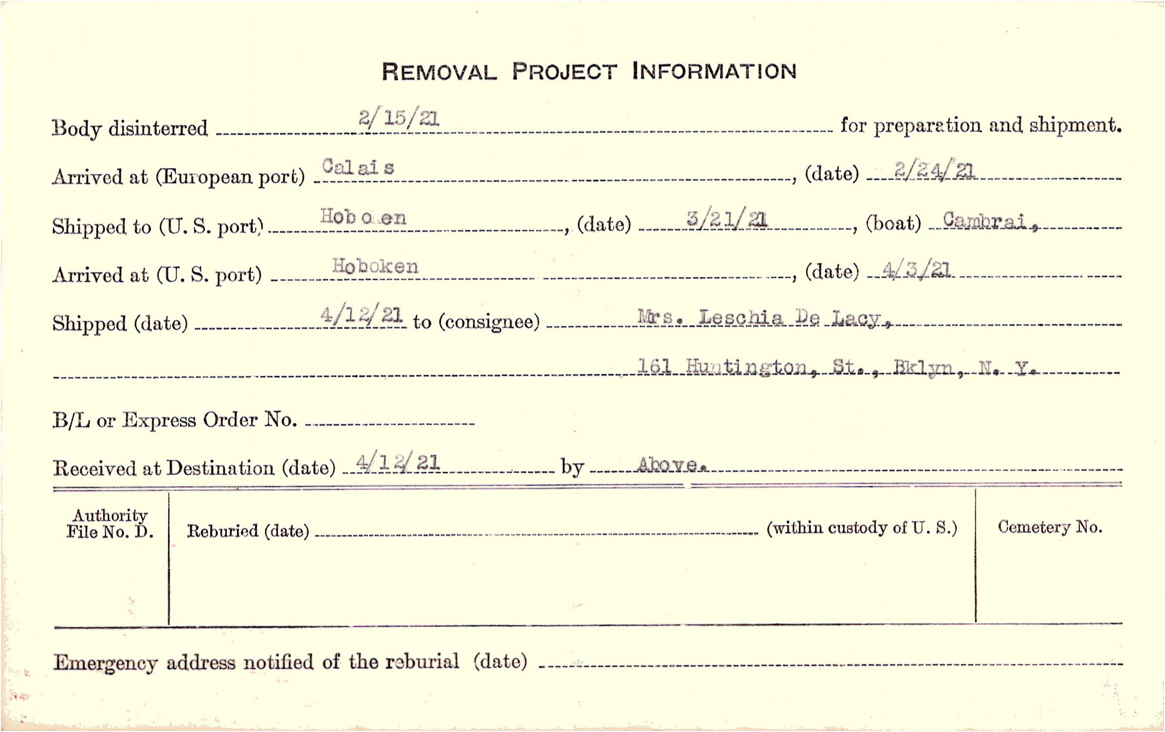 to Mrs. Leschia De Lacy, 161 Huntington, St., Bklyn, N. Y.