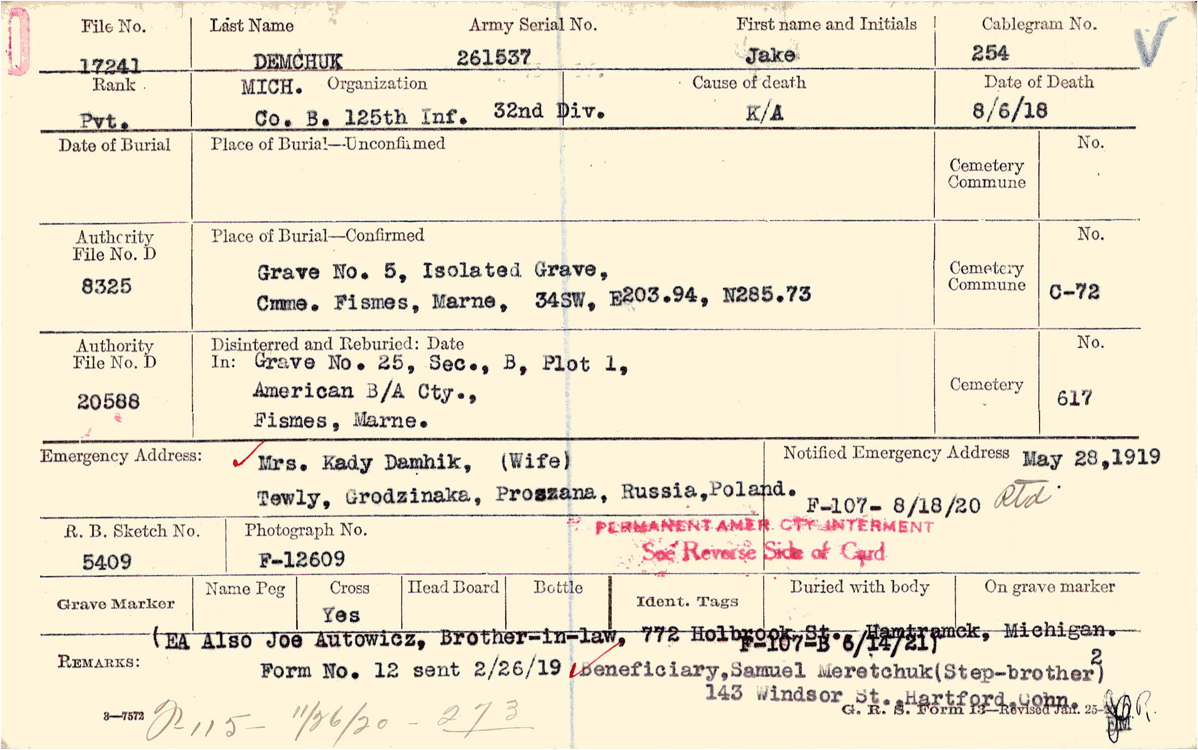 (EA Also Joe Autowicz, Brother-in-law, 772 Holbrook St. Hamiramck, Michigan. F-107-B 6/14/21) Beneficiary, Samuel Meretchuk (Step-brother) 143 Windsor St., Hartford, Conn., Form No. 12 sent 2/26/19 Beneficiary, Samuel Meretchuk (Step-brother) 143 Windsor St. Hartford, Conn., F115 - 11/26/20 - 273