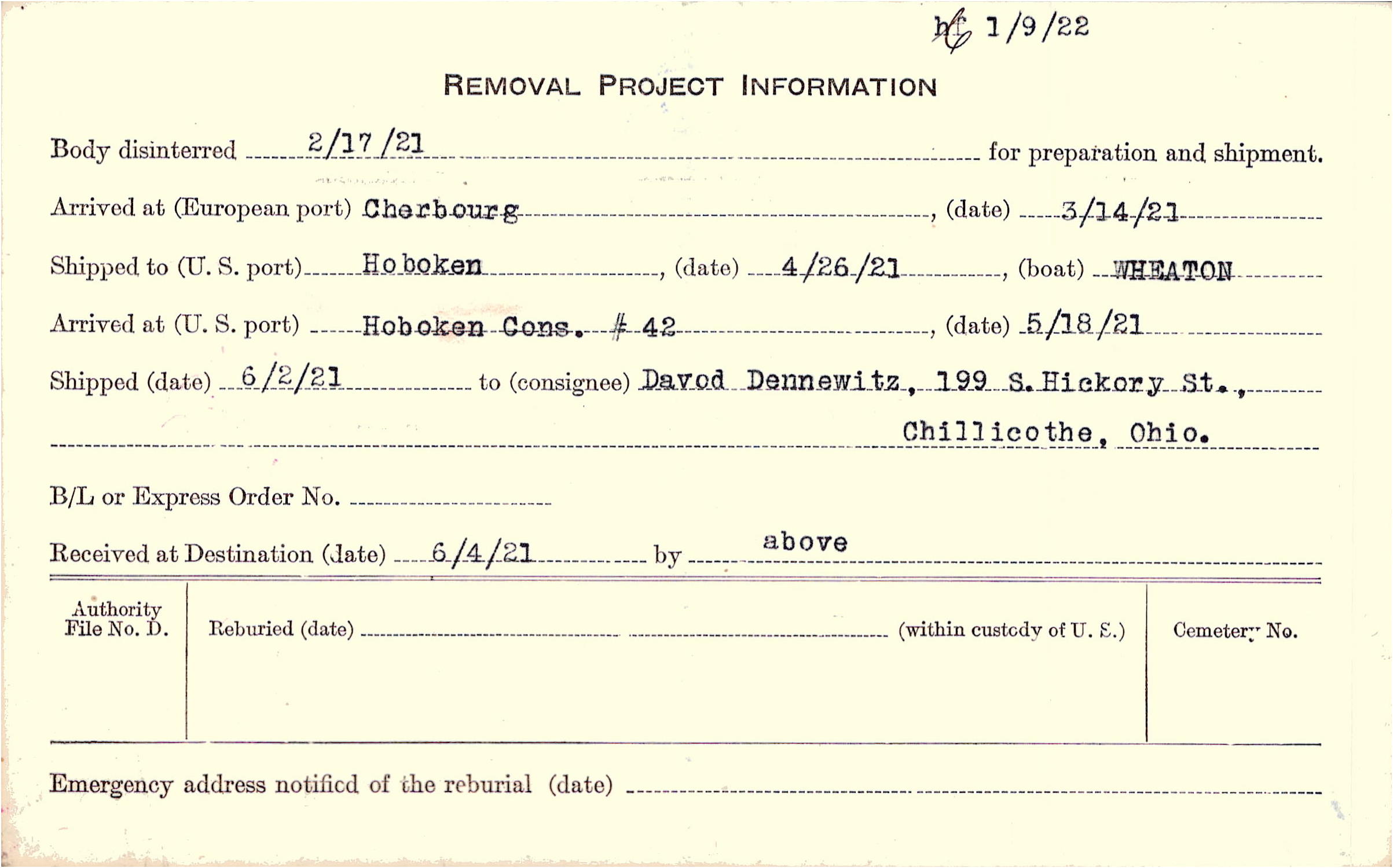 Body disinterred 2/17/1921 for preparation and shipment.