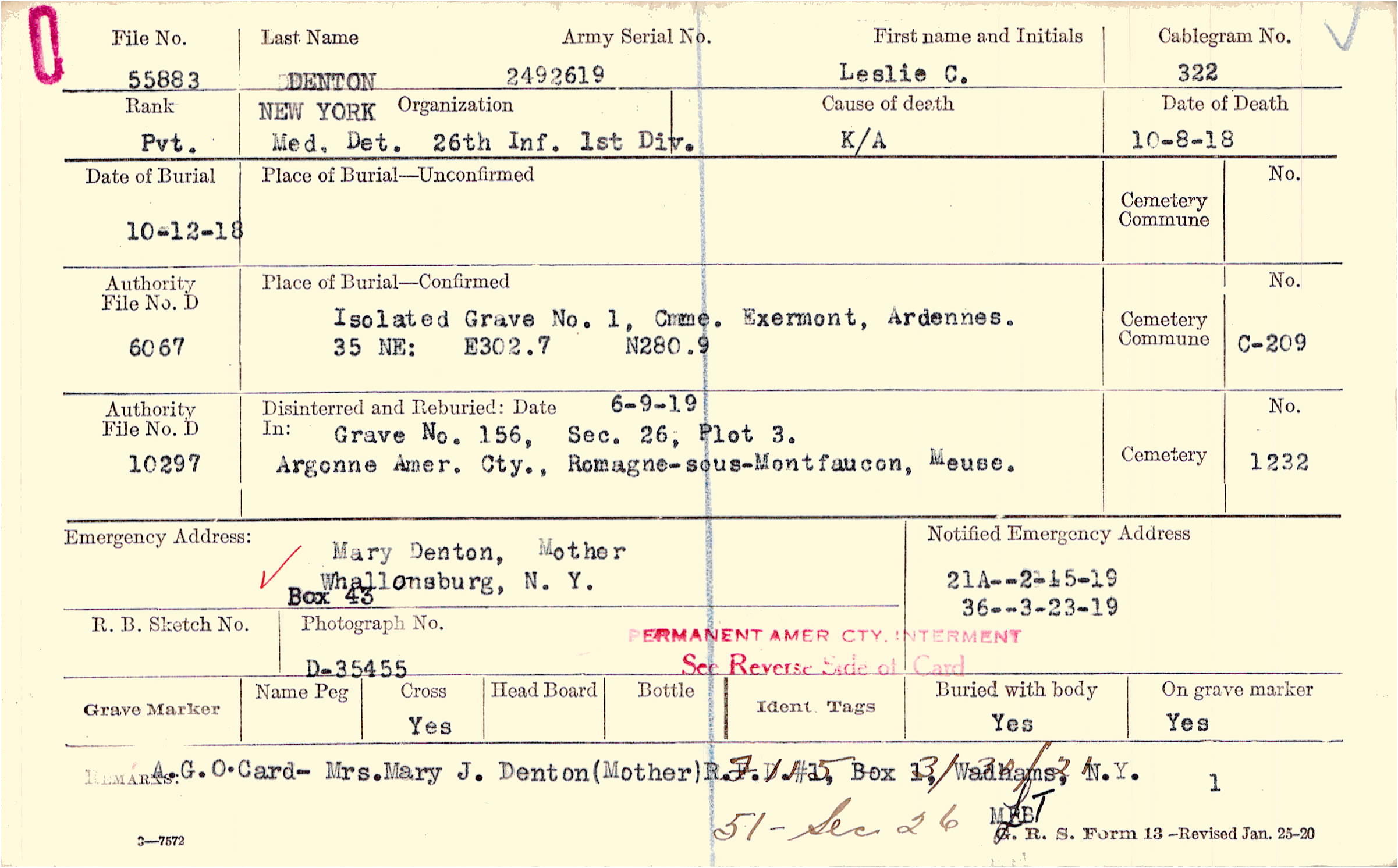 A.G.O. Card - Mrs. Mary J. Denton (Mother) R.F.D #1, Box 1, Wadhams, N.Y., F115 - 3/30/21 51 - Sec 26