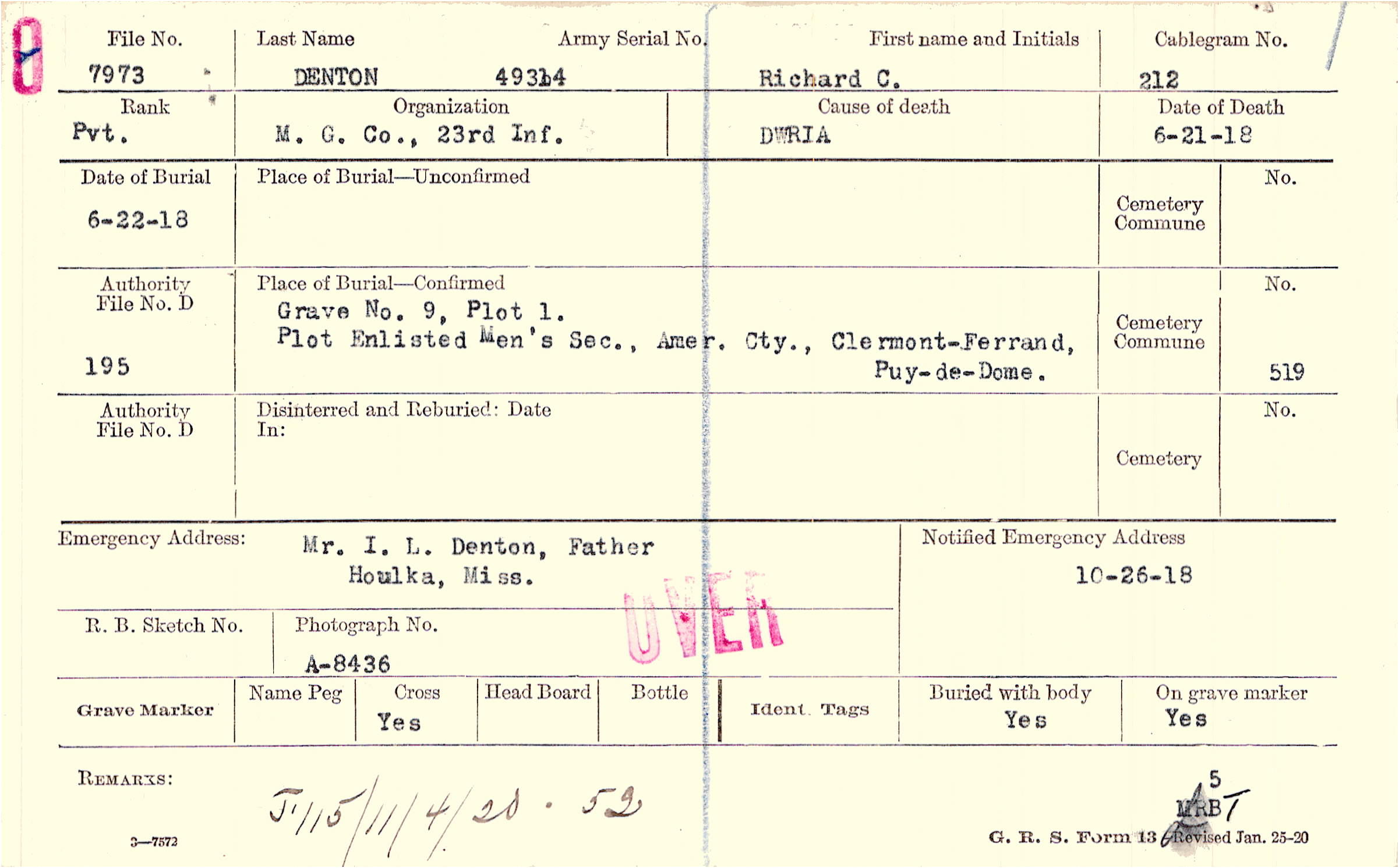 Grave 9, Plot 1, Plot Enlisted Men's Sec., Amer. Cty., Clermont-Ferrand, Puy-de-Dome