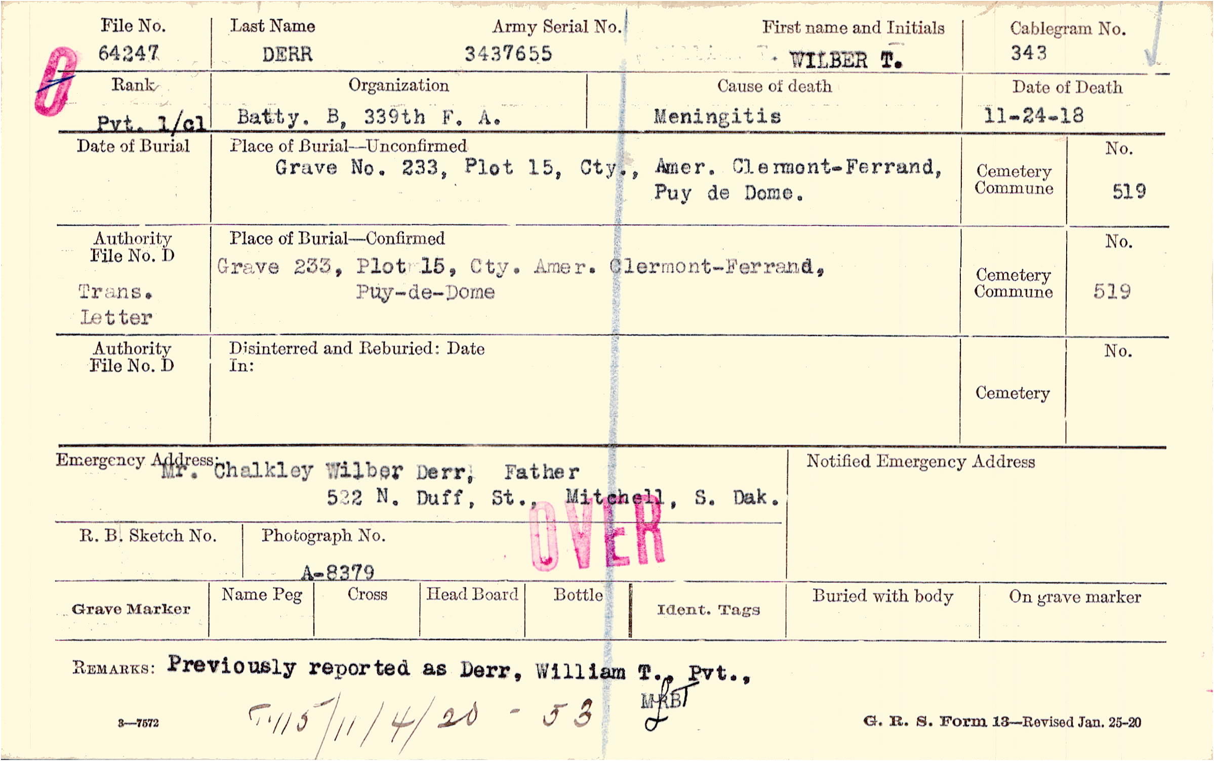 Grave No. 233, Plot 15, Cty., Amer. Clermont-Ferrand, Puy de Dome.