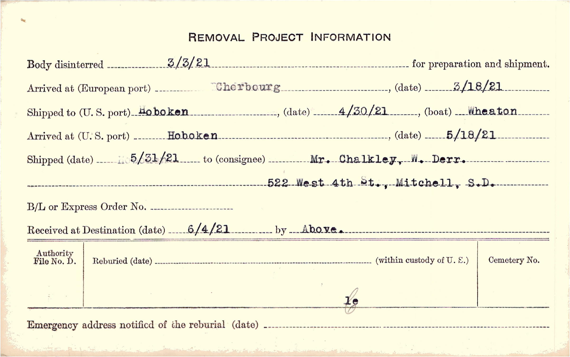 Mr. Chalkley Wilber Derr, Father, 522 N. Duff, St., Mitchell, S. Dak.