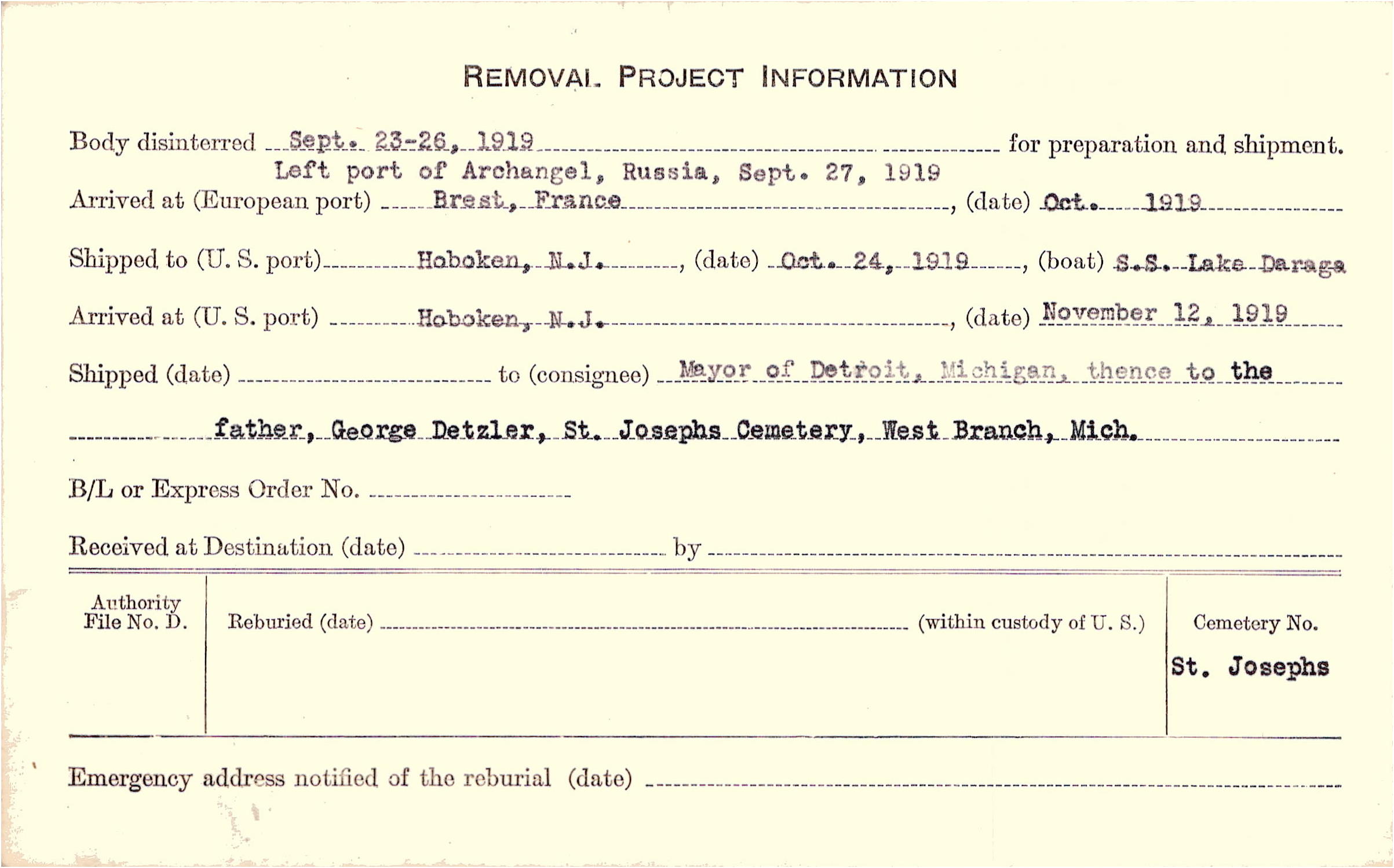 to Mayor of Detroit, Michigan, thence to the father, George Detzler, St. Josephs Cemetery, West Branch, Mich.