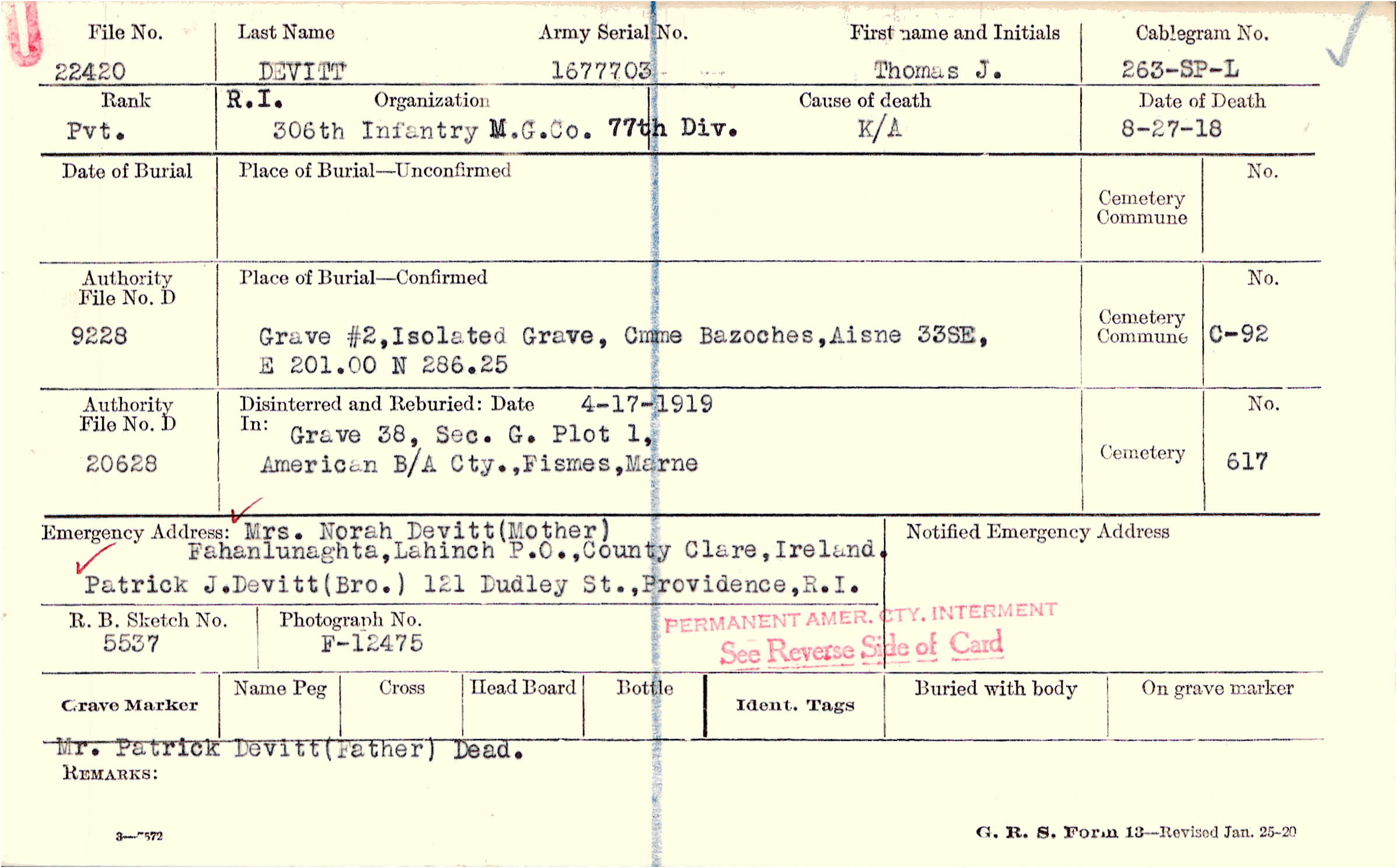 Mrs. Norah Devitt (Mother), Fahanlunaghta,Lahinch P.O.,Country Clare, Ireland, Patrick J. Devitt (Bro.) 121 Dudley St., Providence, R.I.