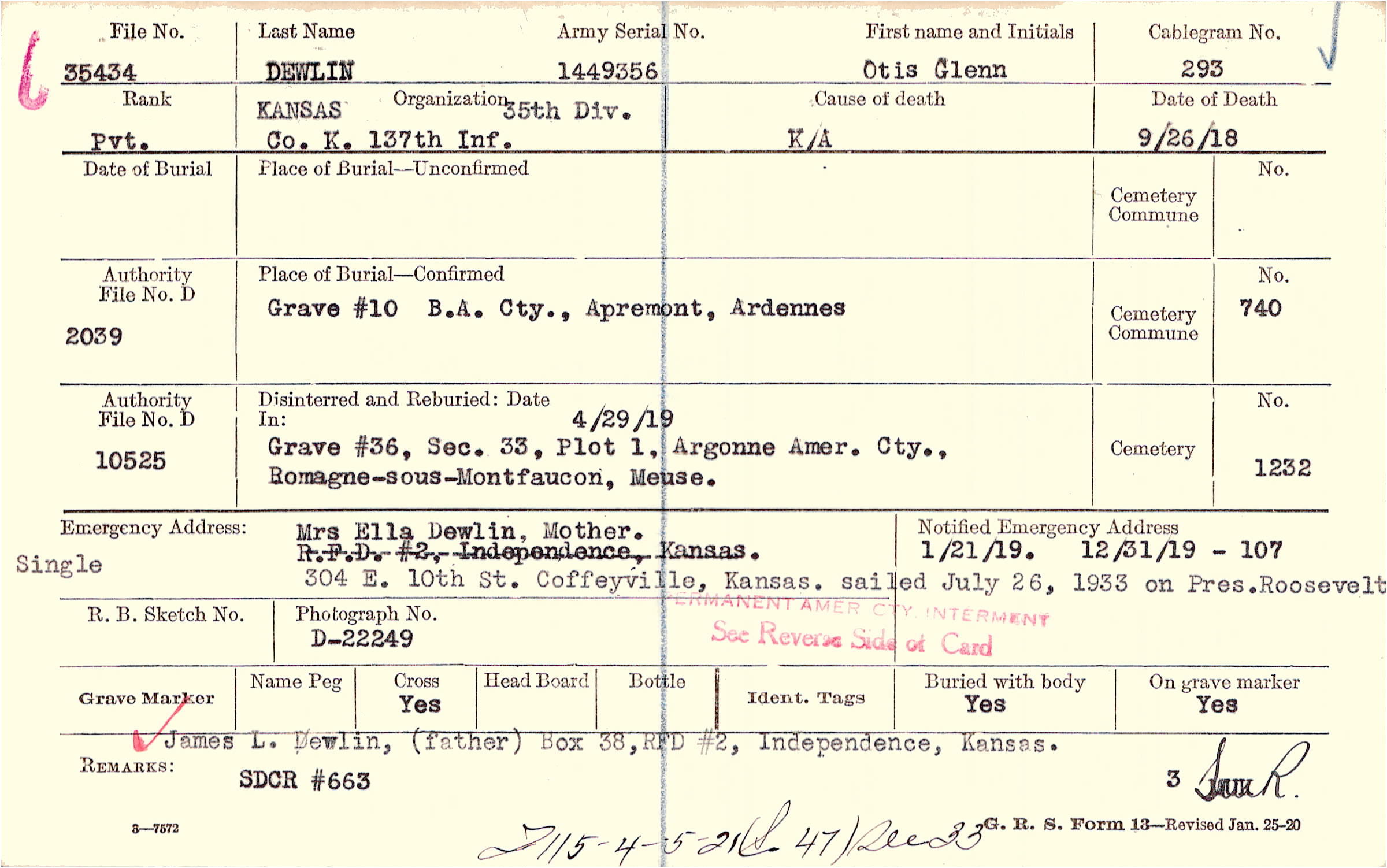James L. Dewlin, (father) Box 38, RFD #2, Independence, Kansas., F115 - 4-5-21 (S47) sec 33, SDCR #663