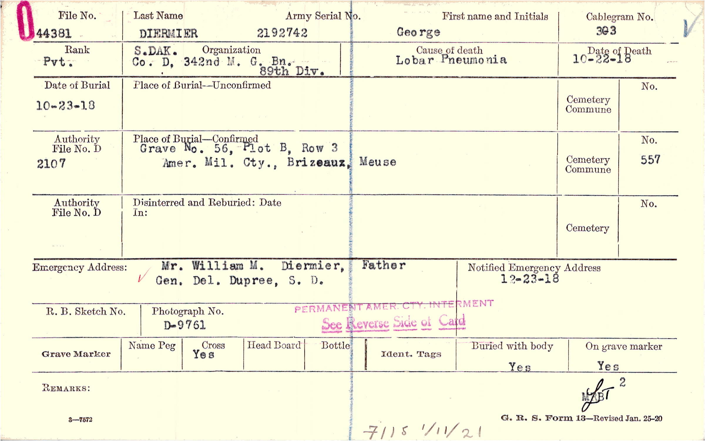 Mr. William M. Diermier, Father, Gen. Del. Dupree, S. D.