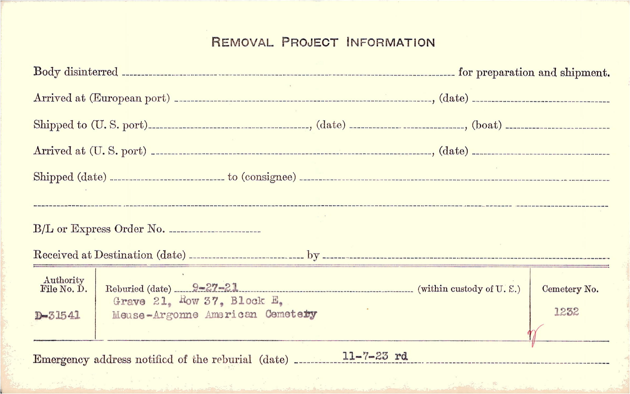 | Permanent Burial in Foreign Cemetery |