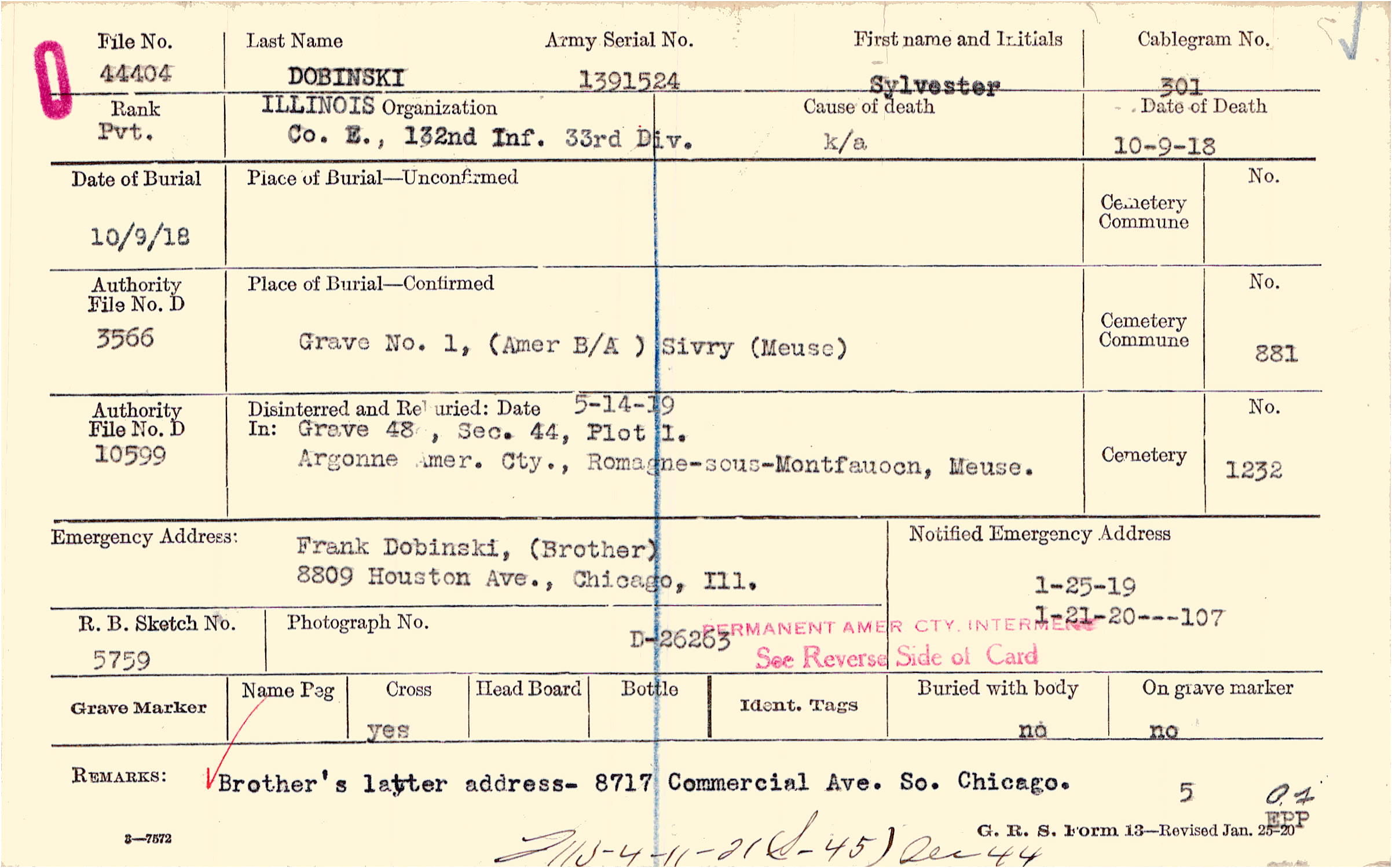Frank Dobinski, (Brother), 8809 Houston Ave., Chicago, Ill.