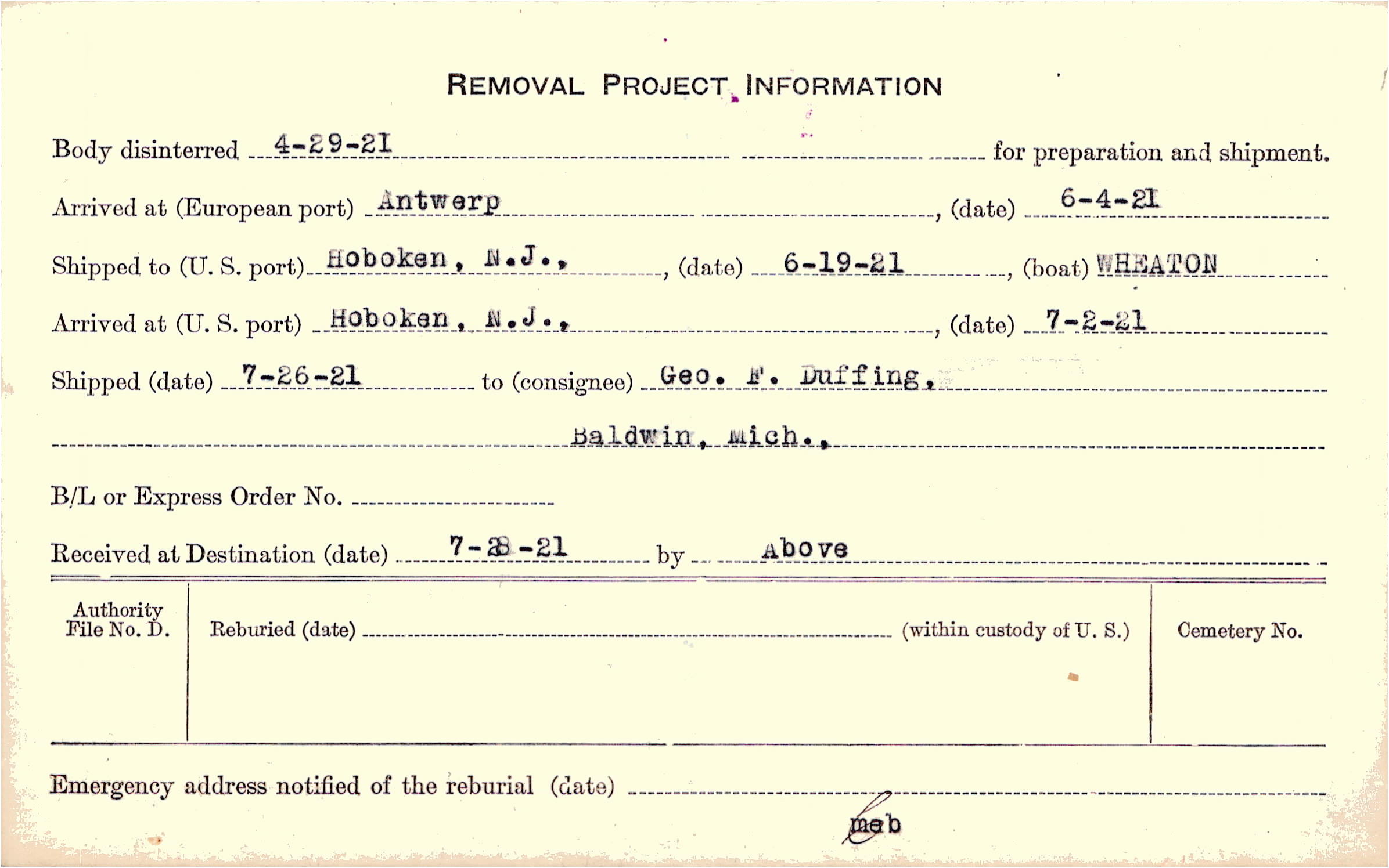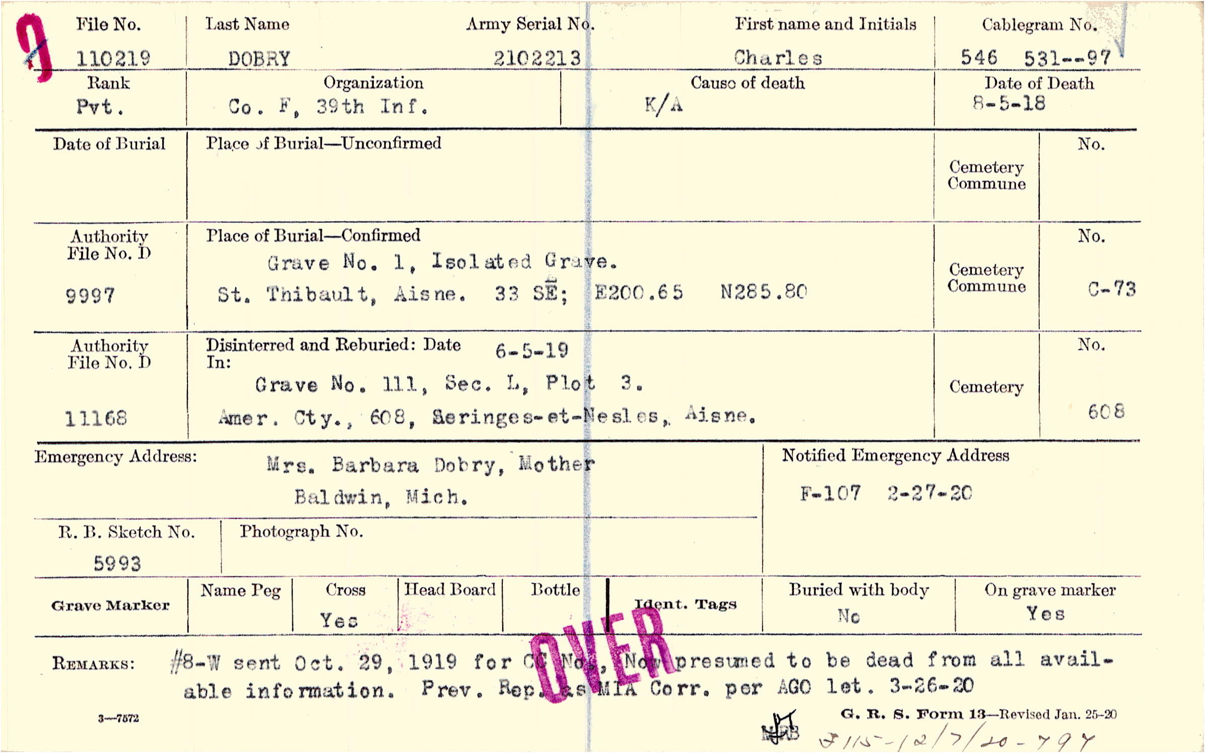 #8-W sent Oct. 29, 1919 for CC No., Now presumed to be dead from all available information., F115-12/7/20 - 797