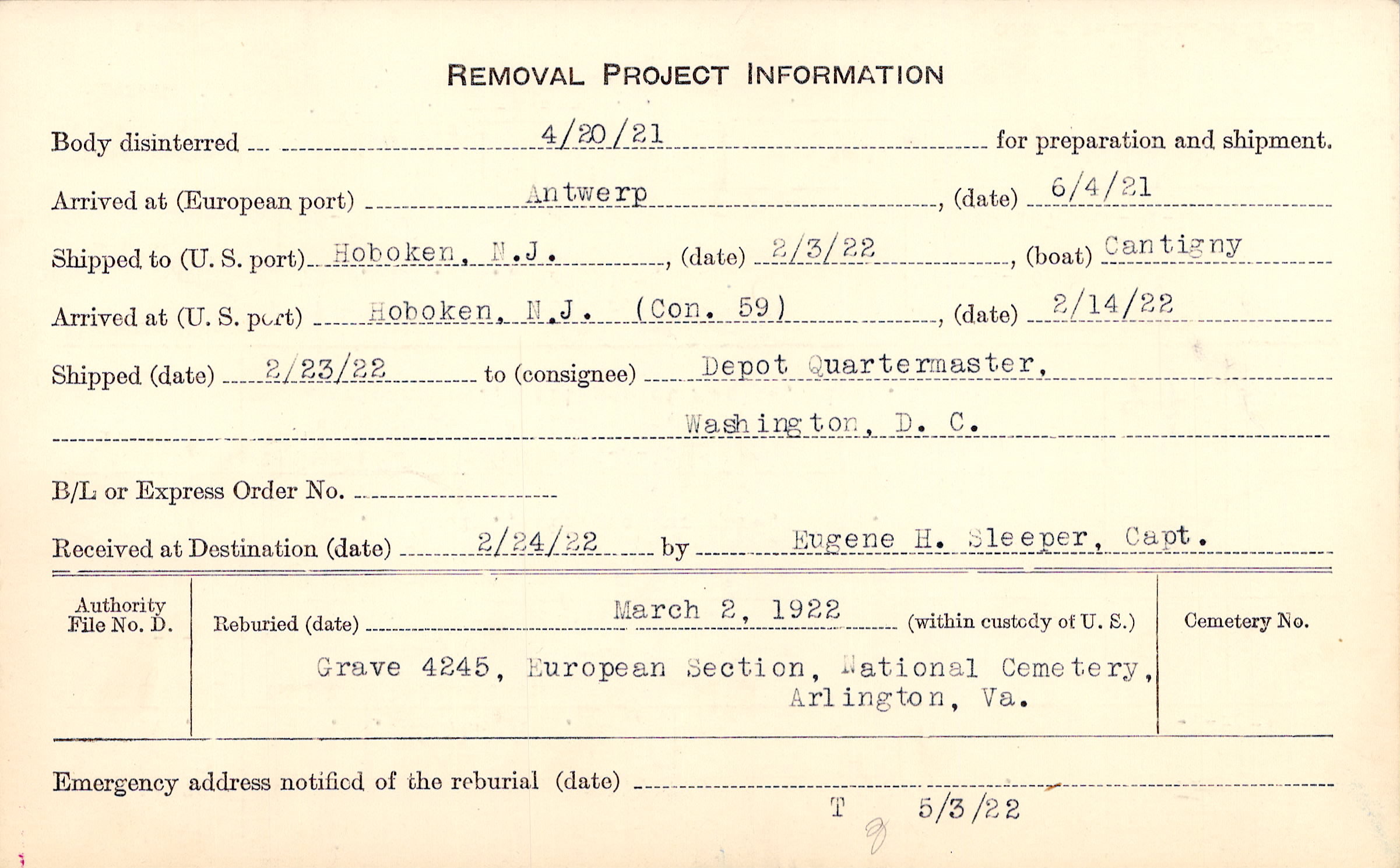 Body disinterred 4/20/1921 for preparation and shipment.