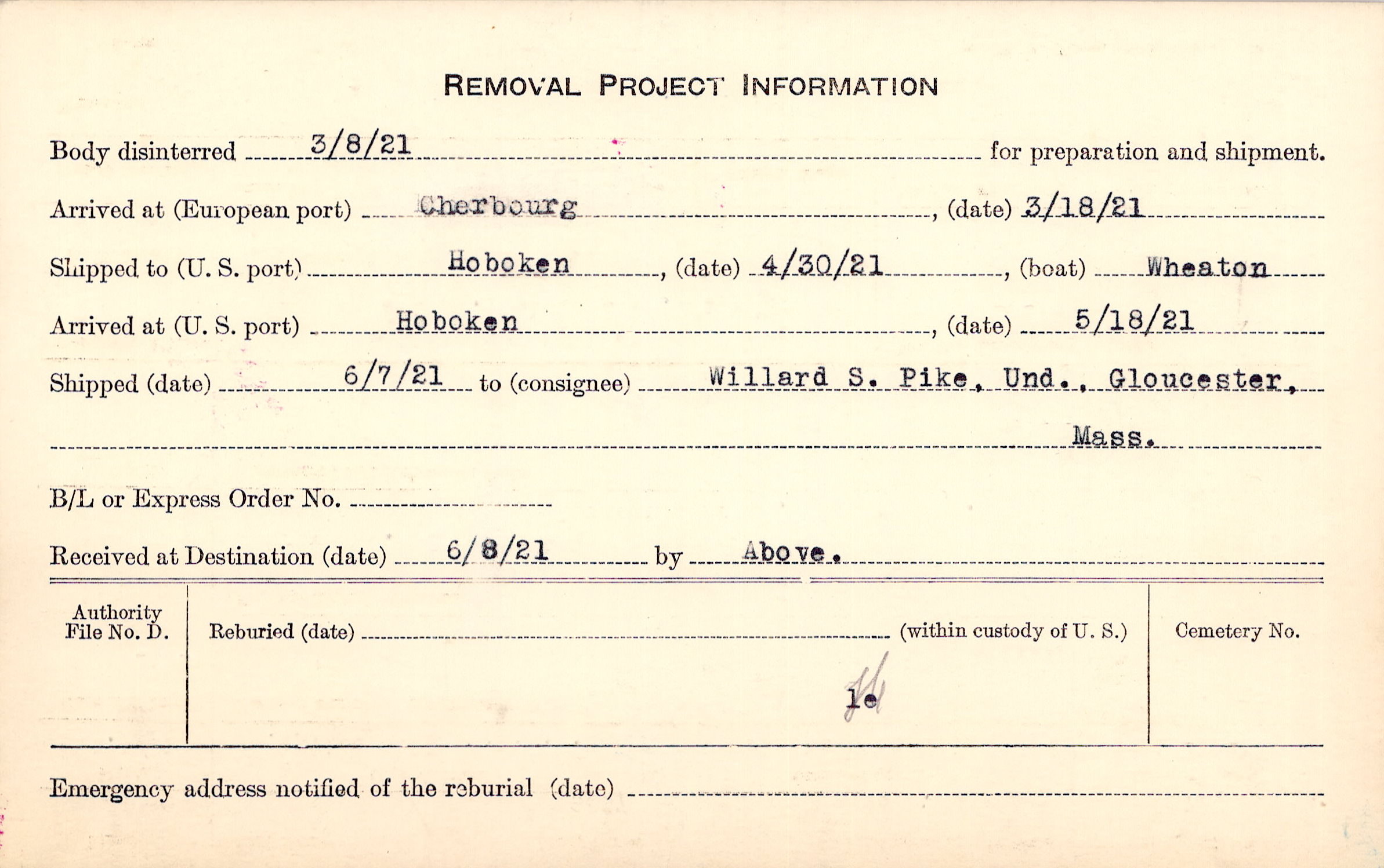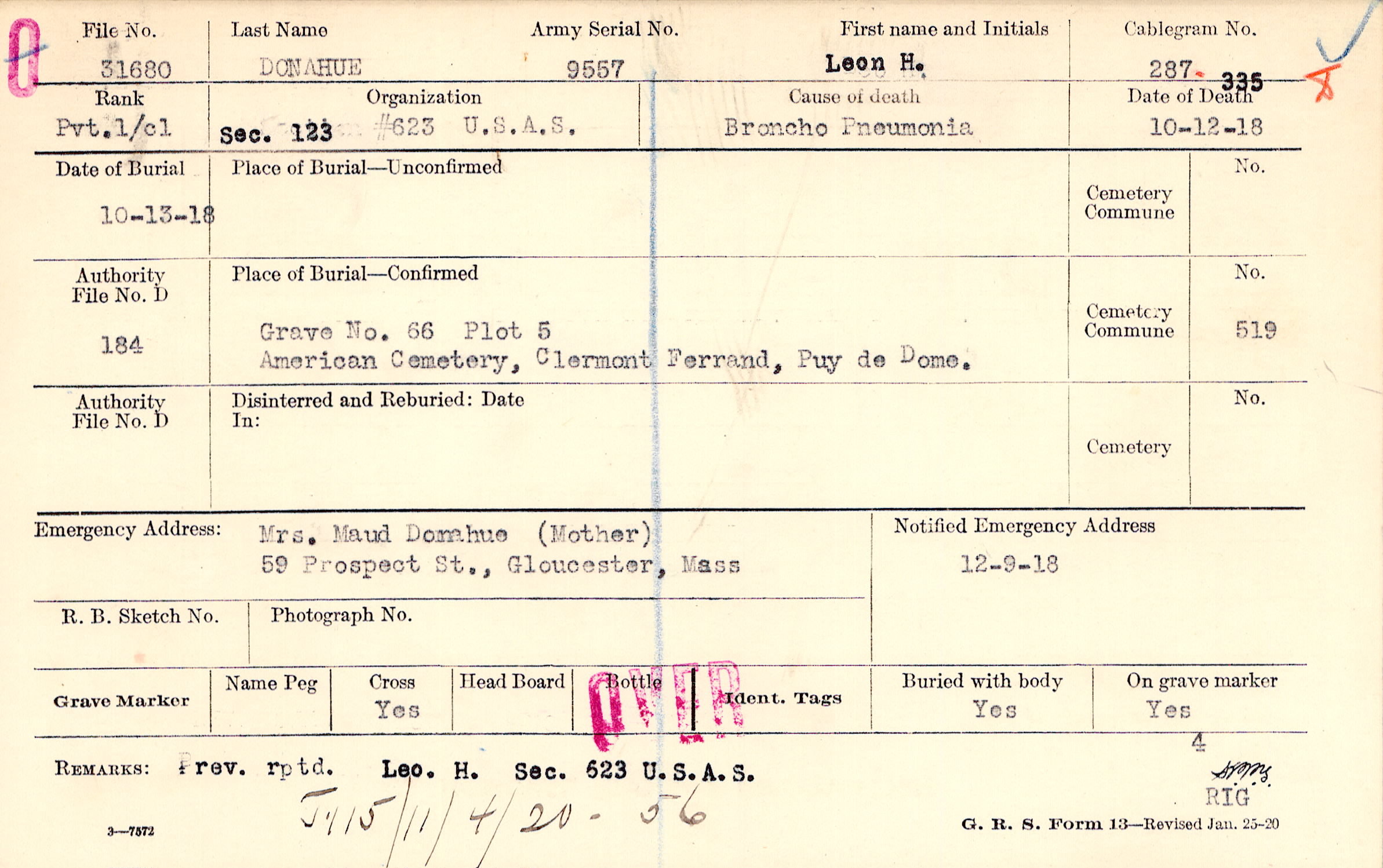 Mrs. Maud Donahue (Mother), 59 Prospect St., Gloucester, Mass