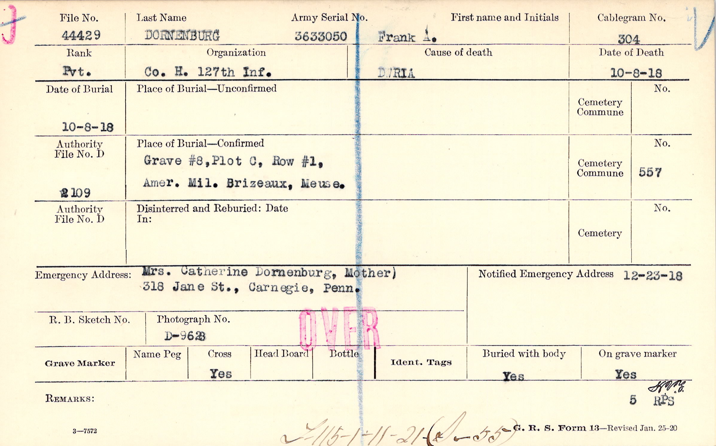 Mrs. Catherine Dornenburg, Mother), 318 Jane St., Carnegie, Penn.