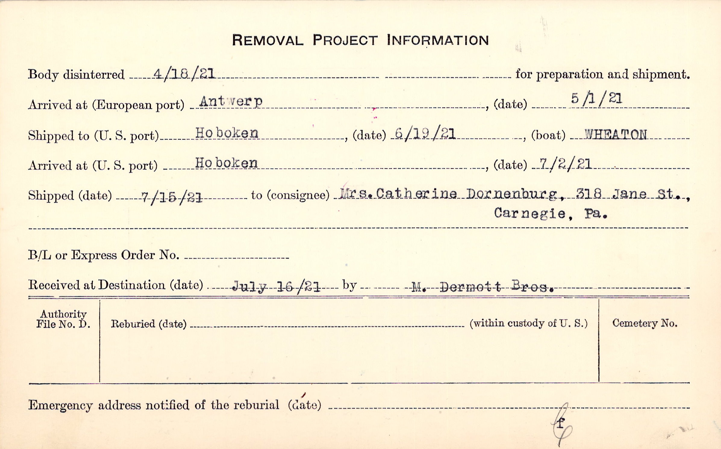 Body disinterred 4/18/1921 for preparation and shipment.
