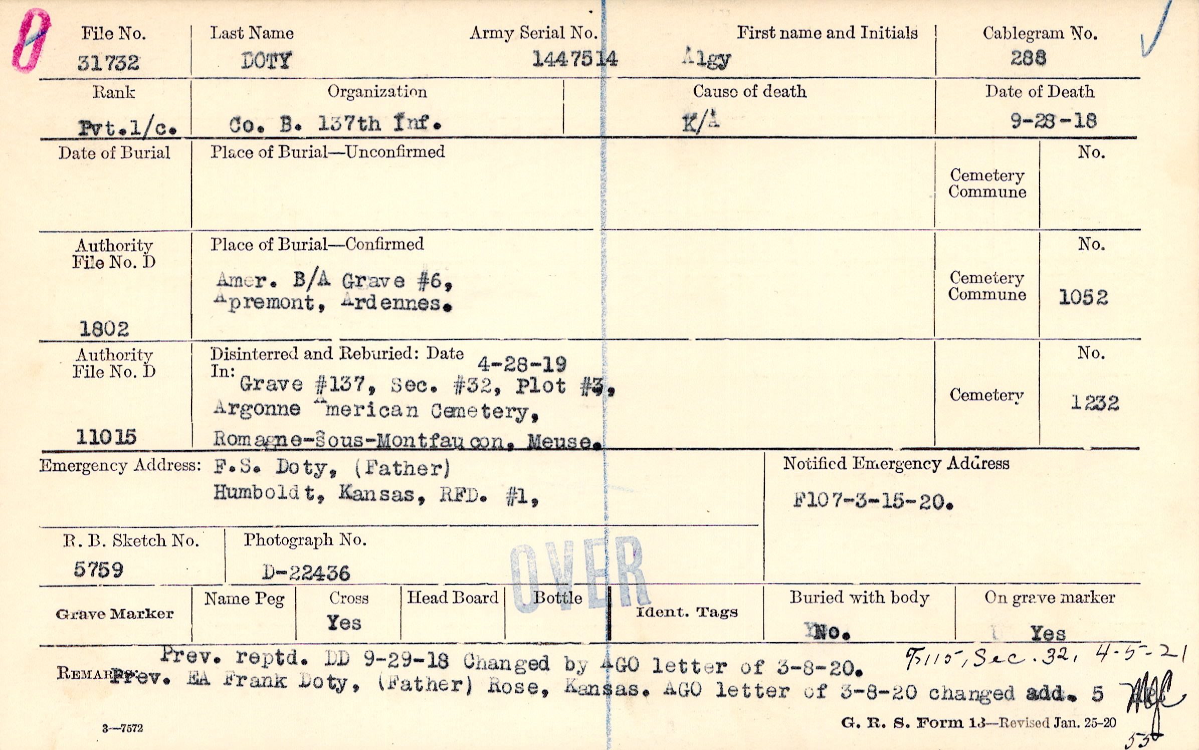 Grave 137, Section 32, Plot 3, Argonne American Cemetery, Romagne-sous-Montfaucon, Meuse