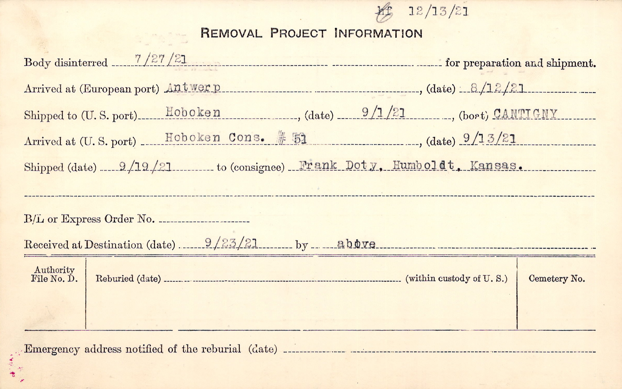 Body disinterred 7/27/1921 for preparation and shipment.