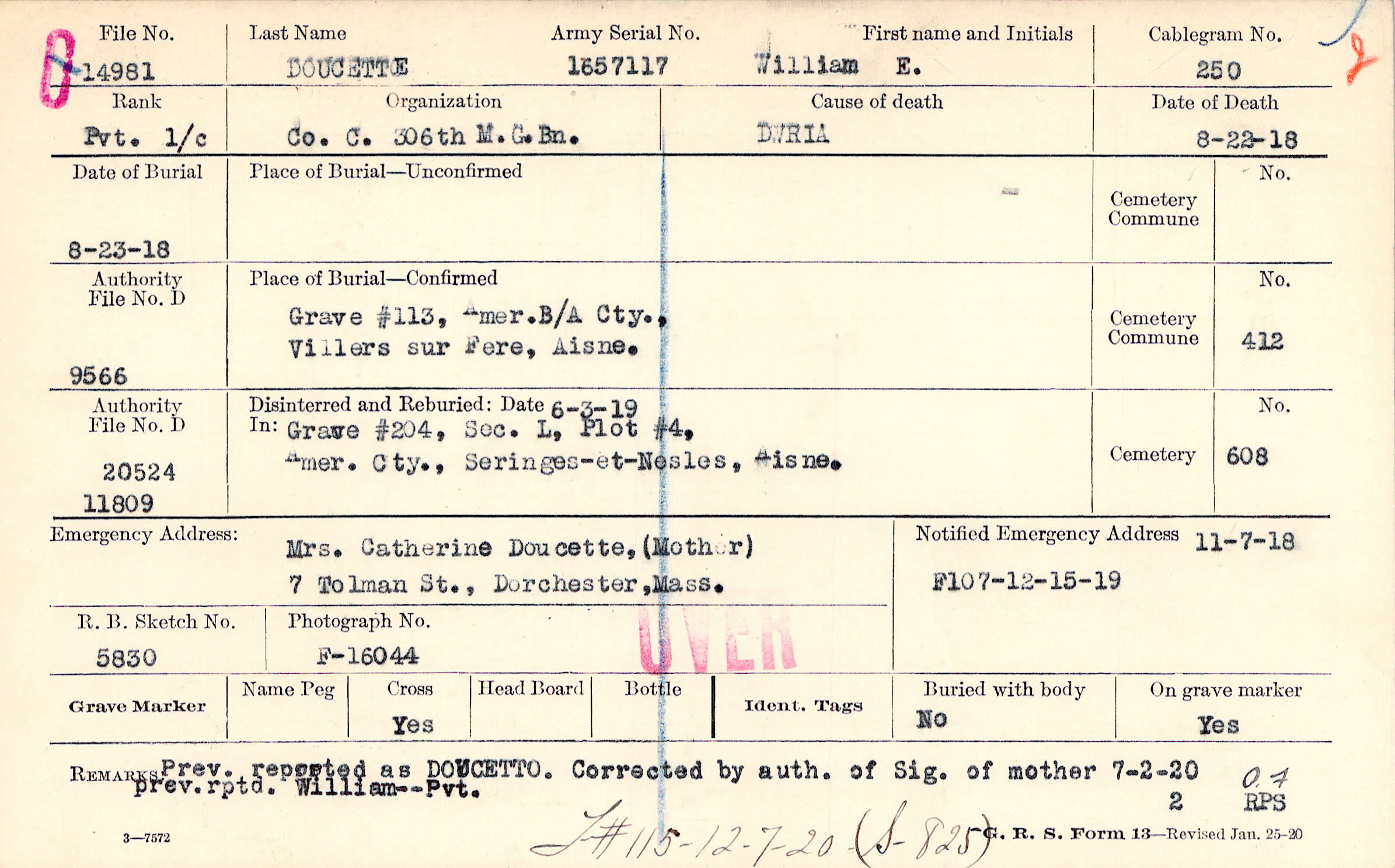 Prev. reported as DOUCETTO. Corrected by auth. of Sig. of mother 7-2-20. prev. rptd. William--Pvt., F#115-12-7-20 (S-825)