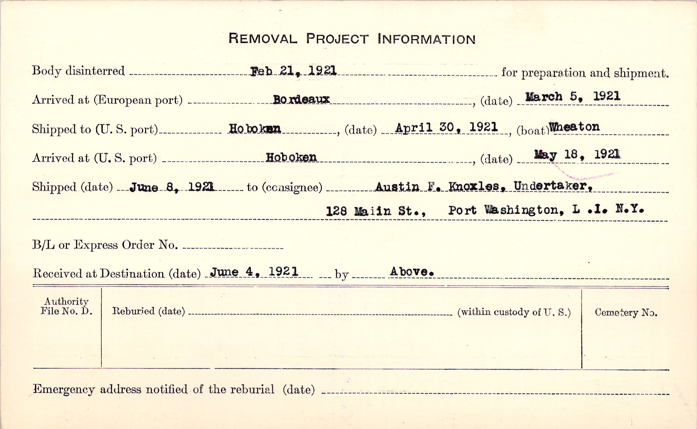 to Austin F. Knoxles, Undertaker, 128 Maiin St., Port Washington, L .I. N.Y.