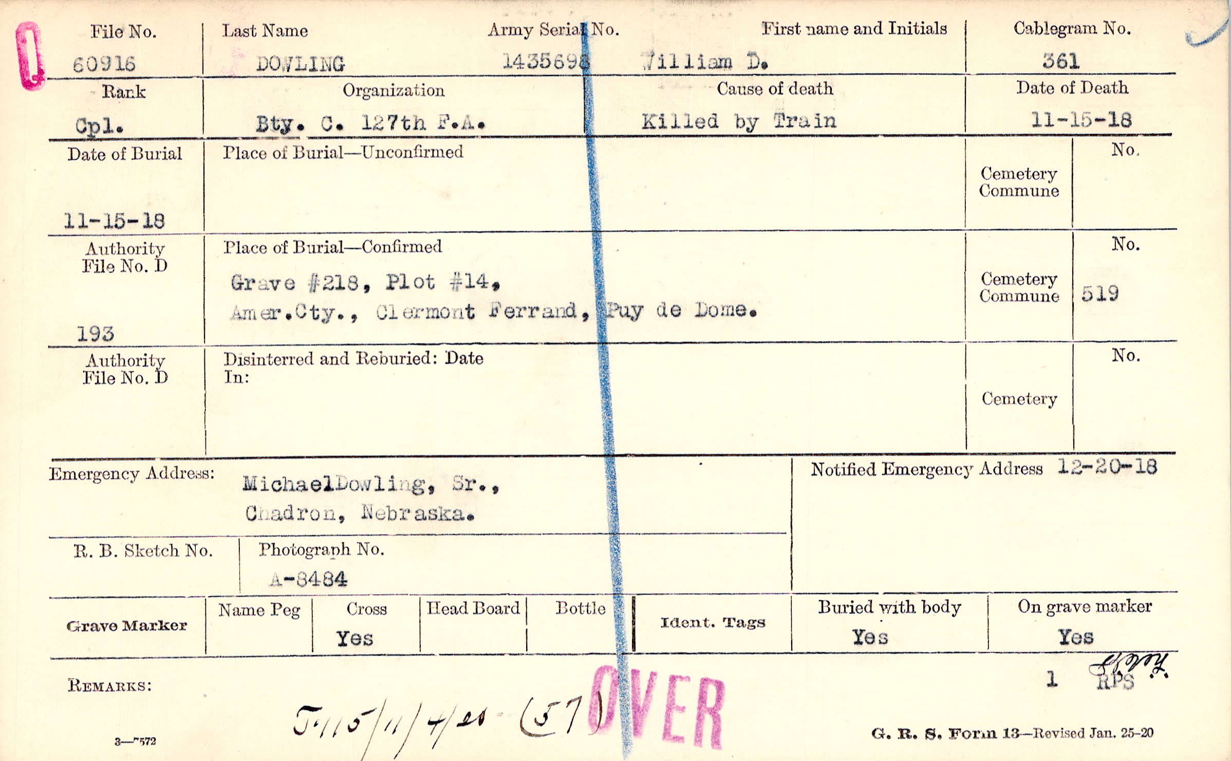 Grave #218, Plot #14, Amer. Cty., Clermont Ferrand, Puy de Dome.