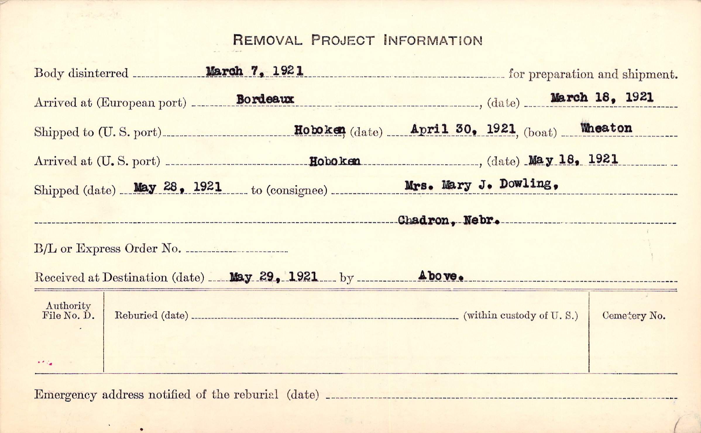 Body disinterred 3/7/1921 for preparation and shipment.