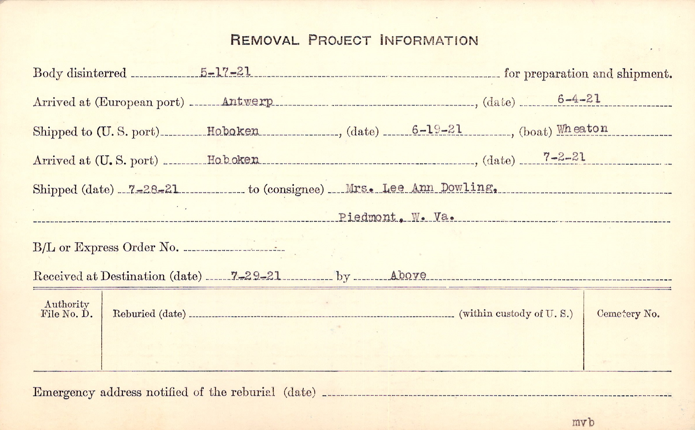 Body disinterred 5/17/1921 for preparation and shipment.