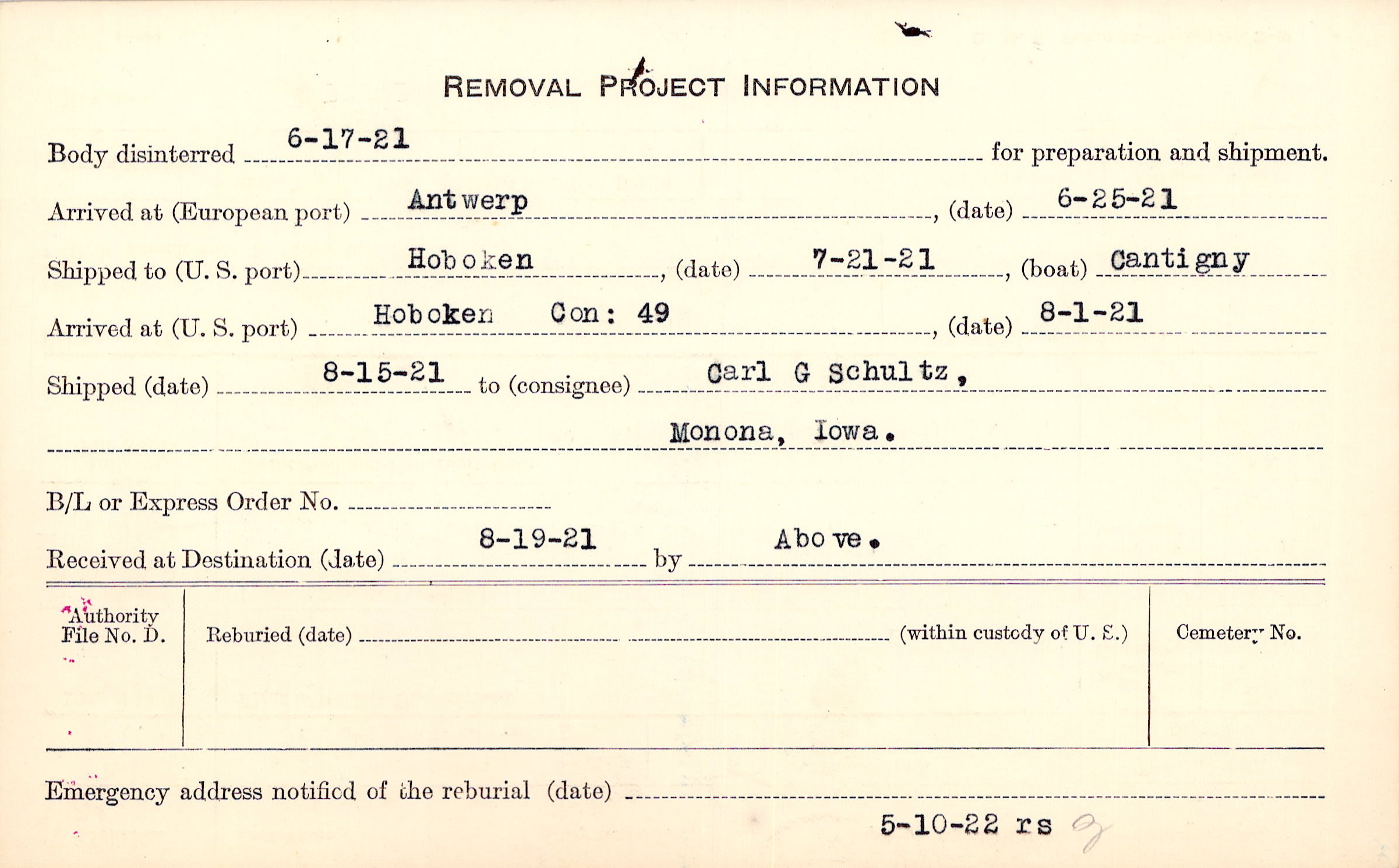 Body disinterred 6/17/1921 for preparation and shipment.