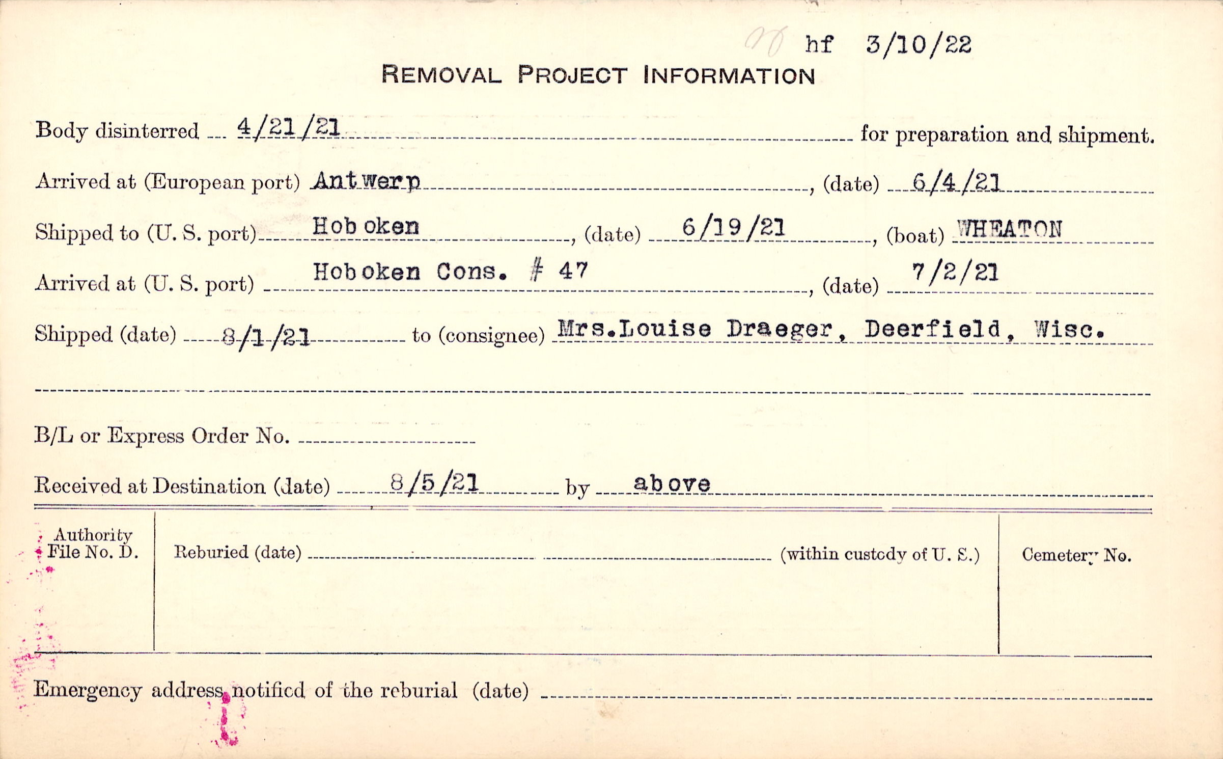 Body disinterred 4/21/1921 for preparation and shipment.