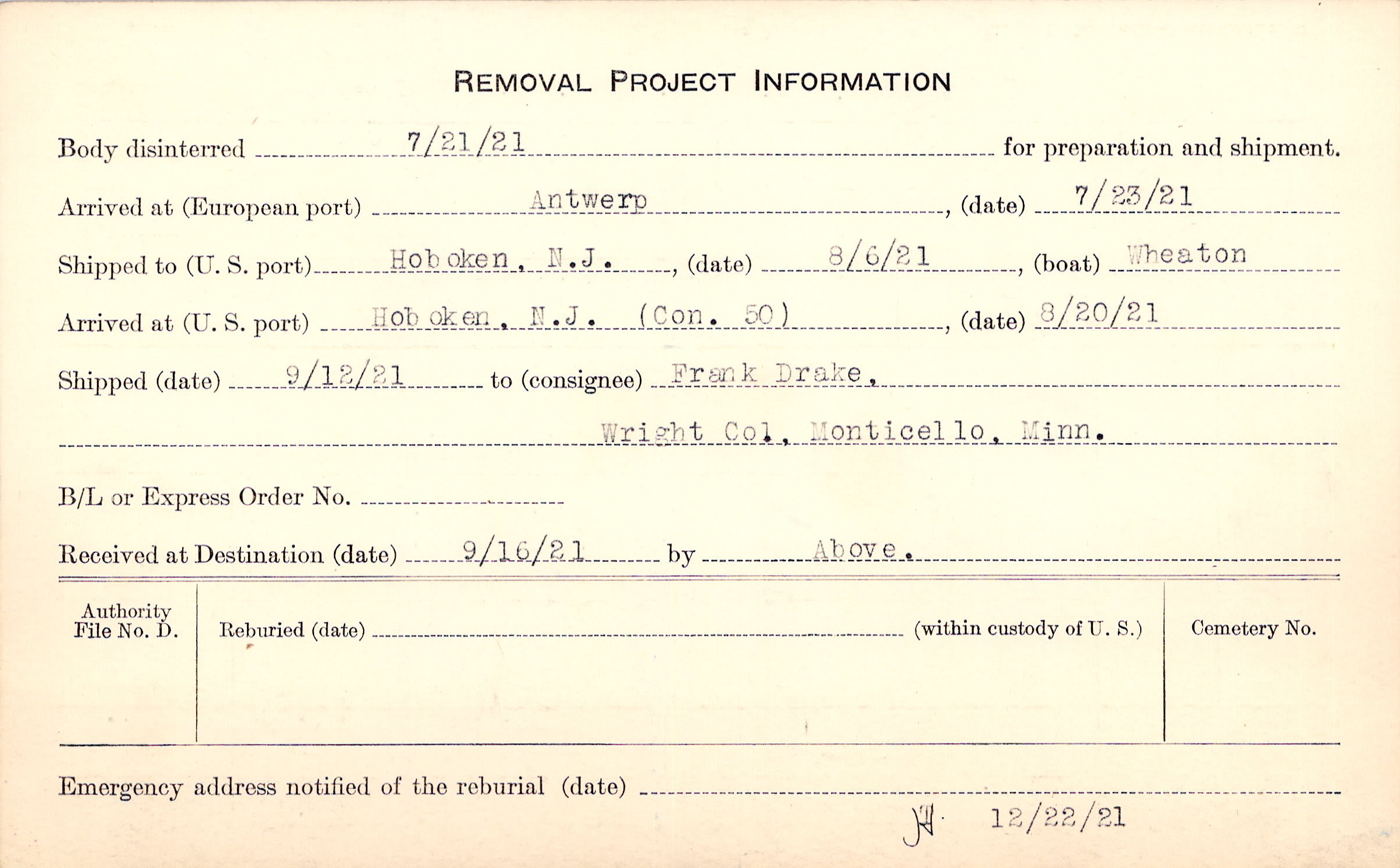 Body disinterred 7/21/1921 for preparation and shipment.
