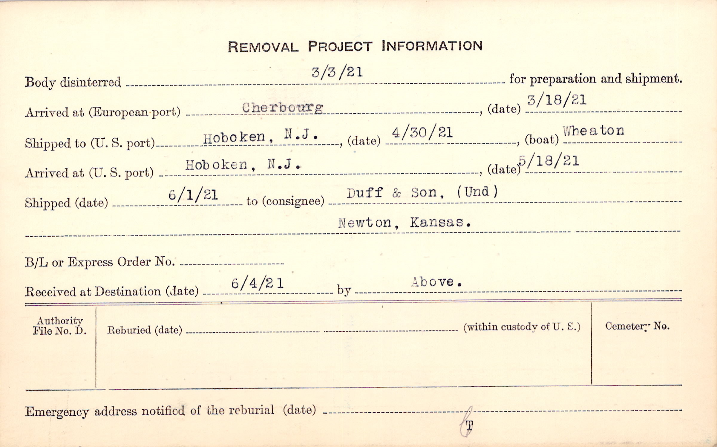 Body disinterred 3/3/1921 for preparation and shipment.