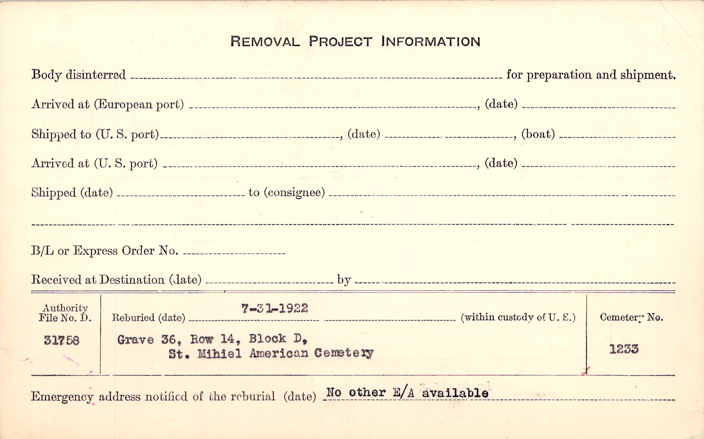 Grave 10, Section 6, Plot 1, St. Mihiel American Cemetery, Thiaucourt, Meurthe-et-Moselle