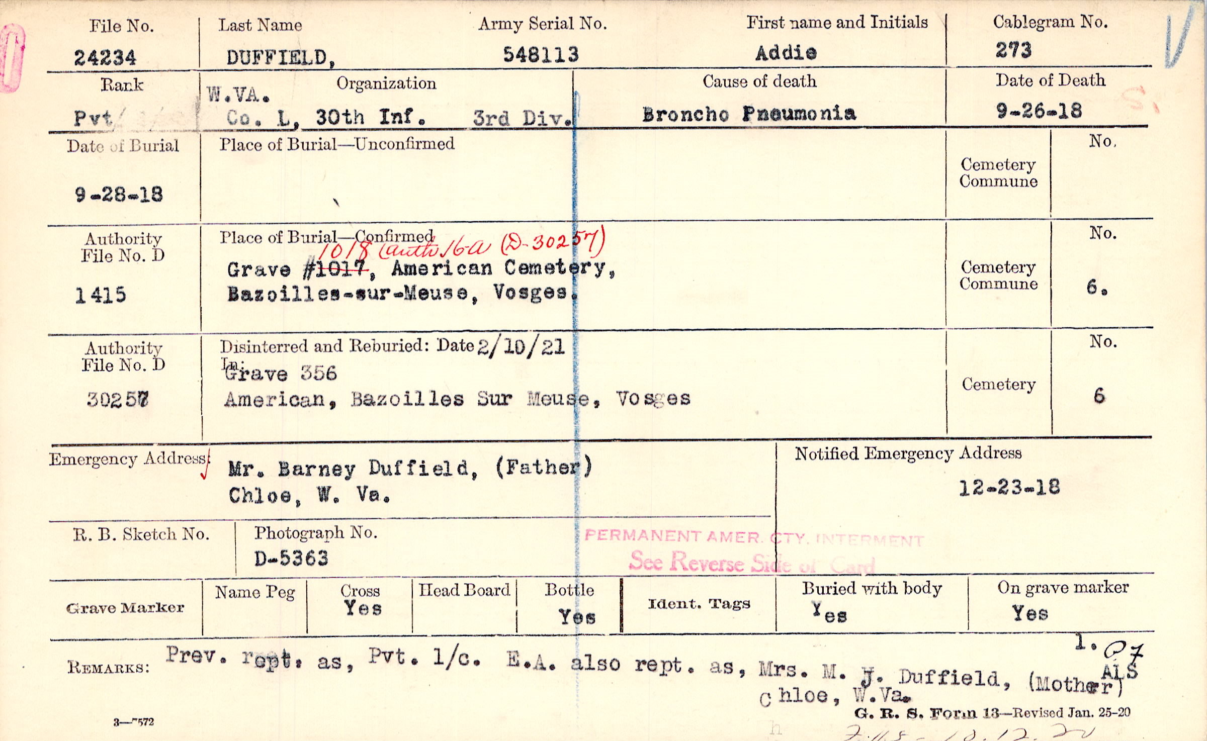Grave #1018, American Cemetery, Bazoilles-sur-Meuse, Vosges.