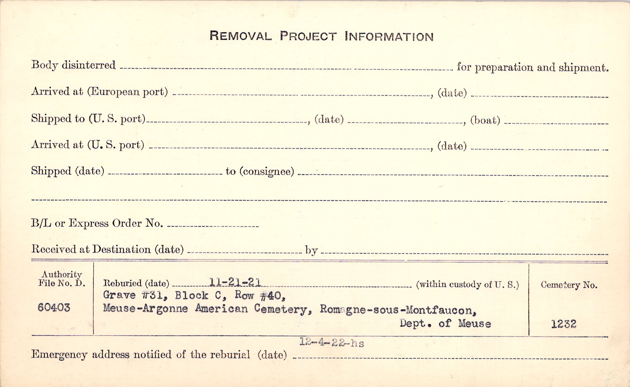 | Permanent Burial in Foreign Cemetery |